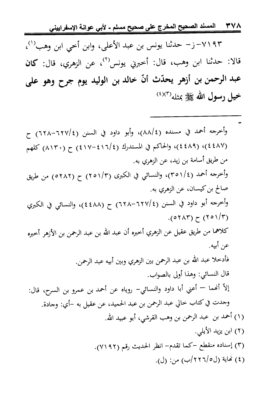 7193 - ز- حدثنا يونس بن عبد الأعلى، وابن أخي ابن وهب (¬1)، قالا: حدثنا ابن وهب، قال: أخبرني يونس (¬2)، عن الزهري، قال: كان عبد الرحمن بن أزهر يحدّث أنّ خالد بن الوليد يوم جرح وهو على خيل رسول الله -صلى الله عليه وسلم- بمثله (¬3) (¬4).