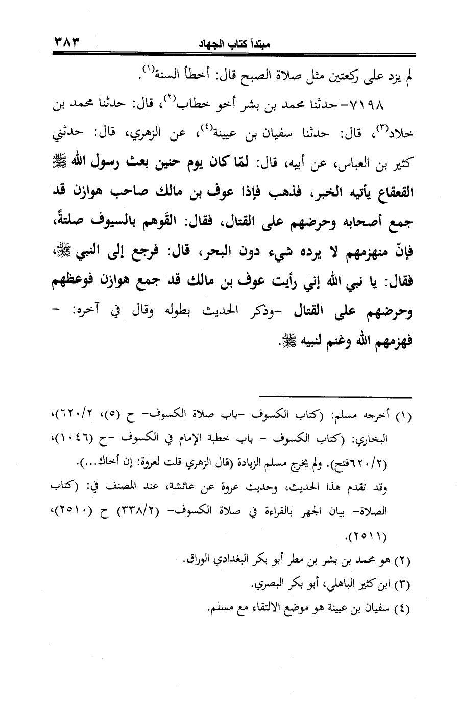 7198 - حدثنا محمد بن بشر أخو خطاب (¬1)، قال: حدثنا محمد بن خلاد (¬2)، قال: حدثنا سفيان بن عيينة (¬3)، عن الزهري، قال: حدثني كثير بن العباس، عن أبيه، قال: لمّا كان يوم حنين بعث رسول الله -صلى الله عليه وسلم- القعقاع يأتيه الخبر، فذهب فإذا عوف بن مالك صاحب هوازن قد جمع أصحابه وحرضهم على القتال، فقال: القَوهم بالسيوف صلتةً، فإنّ منهزمهم لا يرده شيء دون البحر، قال: فرجع إلى النبي -صلى الله عليه وسلم-، فقال: يا نبي الله إني رأيت عوف بن مالك قد جمع هوازن فوعظهم وحرضهم على القتال -وذكر الحديث بطوله وقال في آخره: - فهزمهم الله وغنم لنبيه -صلى الله عليه وسلم-.