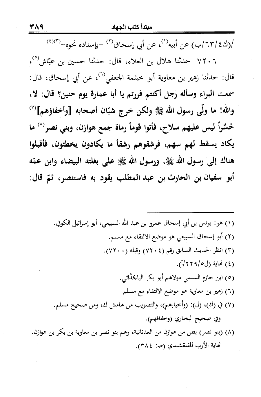 7206 - حدثنا هلال بن العلاء، قال: حدثنا حسين بن عيّاش (¬1)، قال: حدثنا زهير بن معاوية أبو خيثمة الجعفي (¬2)، عن أبي إسحاق، قال: سمعت البراء وسأله رجل أكنتم فررتم يا أبا عمارة يوم حنين؟ قال: لا، والله! ما ولّى رسول الله -صلى الله عليه وسلم- ولكن خرج شبّان أصحابه [وأخفاؤهم] (¬3) حُسَّرًا ليس عليهم سلاح، فأتوا قومًا رماة جمع هوازن، وبني نصر (¬4) ما يكاد يسقط لهم سهم، فرشقوهم رشقًا ما يكادون يخطئون، فأقبلوا هناك إلى رسول الله -صلى الله عليه وسلم-، ورسول الله -صلى الله عليه وسلم- على بغلته البيضاء وابن عمّه أبو سفيان بن الحارث بن عبد المطلب يقود به فاستنصر، ثمّ قال: