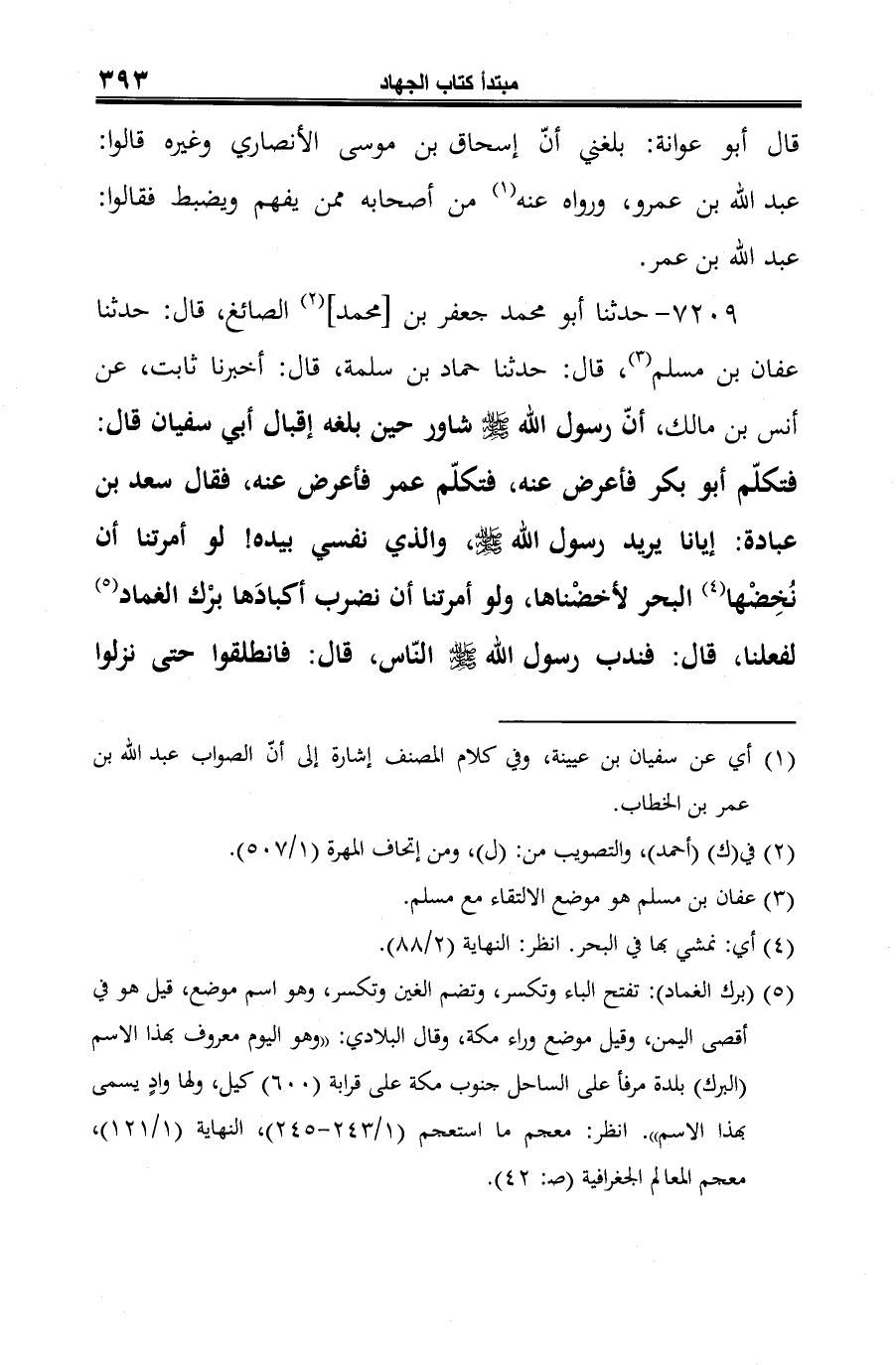 7209 - حدثنا أبو محمد جعفر بن [محمد] (¬1) الصائغ، قال: حدثنا عفان بن مسلم (¬2)، قال: حدثنا حماد بن سلمة، قال: أخبرنا ثابت، عن أنس بن مالك، أنّ رسول الله -صلى الله عليه وسلم- شاور حين بلغه إقبال أبي سفيان قال: فتكلّم أبو بكر فأعرض عنه، فتكلّم عمر فأعرض عنه، فقال سعد بن عبادة: إيانا يريد رسول الله -صلى الله عليه وسلم-، والذي نفسي بيده! لو أمرتنا أن نُخِضْها (¬3) البحر لأخضْناها، ولو أمرتنا أن نضرب أكبادَها برْك الغماد (¬4) لفعلنا، قال: فندب رسول الله -صلى الله عليه وسلم- النّاس، قال: فانطلقوا حتى نزلوا