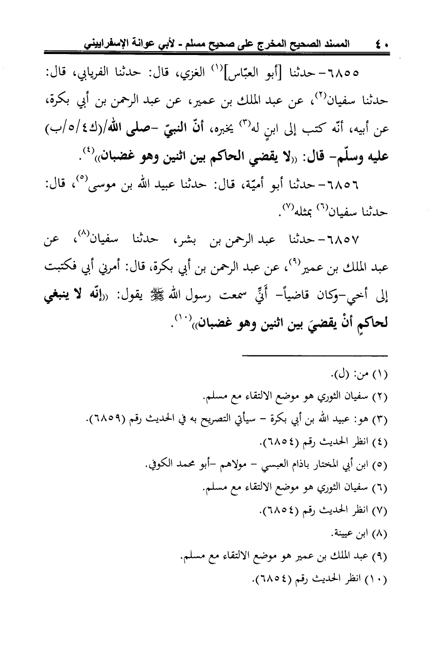 6857 - حدثنا عبد الرحمن بن بشر، حدثنا سفيان (¬1)، عن عبد الملك بن عمير (¬2)، عن عبد الرحمن بن أبي بكرة، قال: أمرني أبي فكتبت إلى أخي -وكان قاضيًا- أَنِّي سمعت رسول الله -صلى الله عليه وسلم- يقول: "إنّه لا ينبغي لحاكمٍ أنْ يقضيَ بين اثنين وهو غضبان" (¬3).