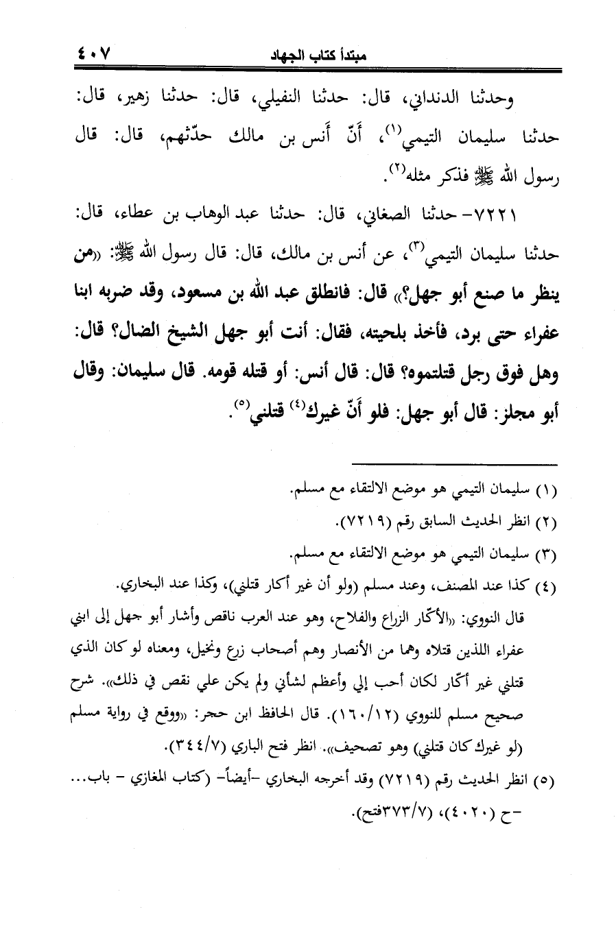 7221 - حدثنا الصغاني، قال: حدثنا عبد الوهاب بن عطاء، قال: حدثنا سليمان التيمي (¬1)، عن أنس بن مالك، قال: قال رسول الله -صلى الله عليه وسلم-: "من ينظر ما صنع أبو جهل؟ " قال: فانطلق عبد الله بن مسعود، وقد ضربه ابنا عفراء حتى برد، فأخذ بلحيته، فقال: أنت أبو جهل الشيخ الضال؟ قال: وهل فوق رجل قتلتموه؟ قال: قال أنس: أو قتله قومه. قال سليمان: وقال أبو مجلز: قال أبو جهل: فلو أَنّ غيرك (¬2) قتلني (¬3).