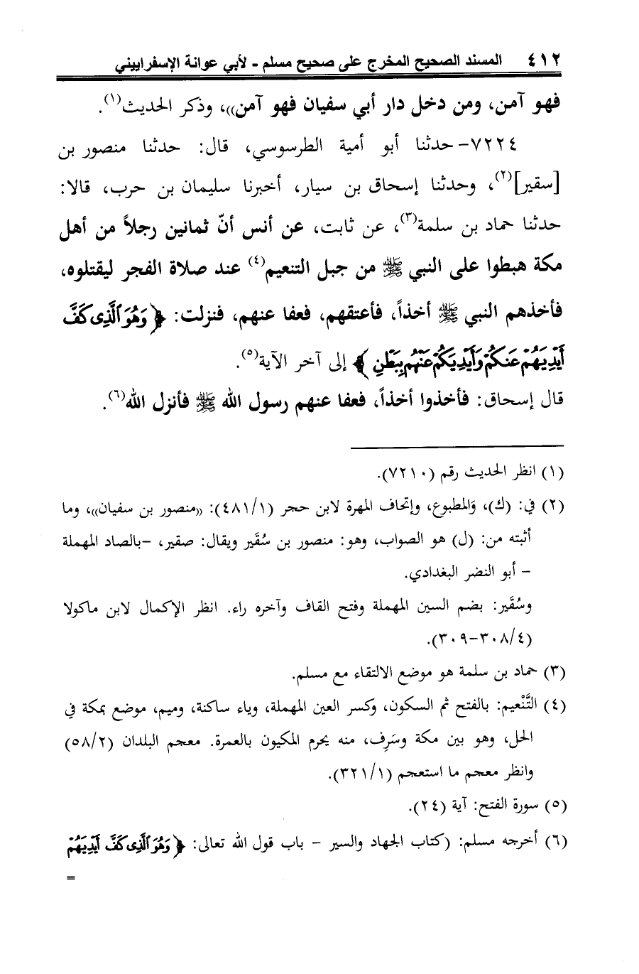 7224 - حدثنا أبو أمية الطرسوسي، قال: حدثنا منصور بن [سقير] (¬1)، وحدثنا إسحاق بن سيار، أخبرنا سليمان بن حرب، قالا: حدثنا حماد بن سلمة (¬2)، عن ثابت، عن أنس أنّ ثمانين رجلًا من أهل مكة هبطوا على النبي -صلى الله عليه وسلم- من جبل التنعيم (¬3) عند صلاة الفجر ليقتلوه، فأخذهم النبي -صلى الله عليه وسلم- أخذًا، فأعتقهم، فعفا عنهم، فنزلت: {وَهُوَ الَّذِي كَفَّ أَيْدِيَهُمْ عَنْكُمْ وَأَيْدِيَكُمْ عَنْهُمْ بِبَطْنِ} إلى آخر الآية (¬4).