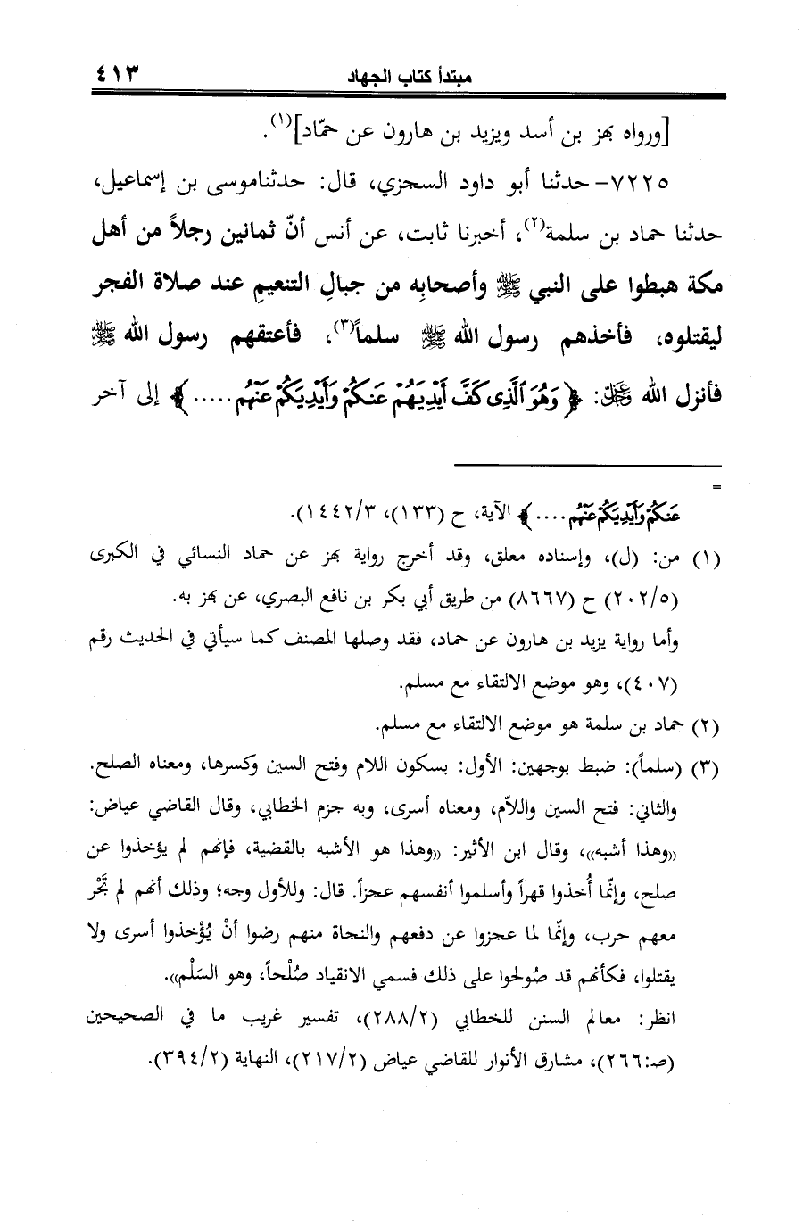 7225 - حدثنا أبو داود السجزي، قال: حدثنا موسى بن إسماعيل، حدثنا حماد بن سلمة (¬1)، أخبرنا ثابت، عن أنس أنّ ثمانين رجلًا من أهل مكة هبطوا على النبي -صلى الله عليه وسلم- وأصحابِه من جبالِ التنعيمِ عند صلاة الفجر ليقتلوه، فأخذهم رسول الله -صلى الله عليه وسلم- سلمًا (¬2)، فأعتقهم رسول الله -صلى الله عليه وسلم- فأنزل الله - عز وجل -: {وَهُوَ الَّذِي كَفَّ أَيْدِيَهُمْ عَنْكُمْ وَأَيْدِيَكُمْ عَنْهُمْ ...} إلى آخر