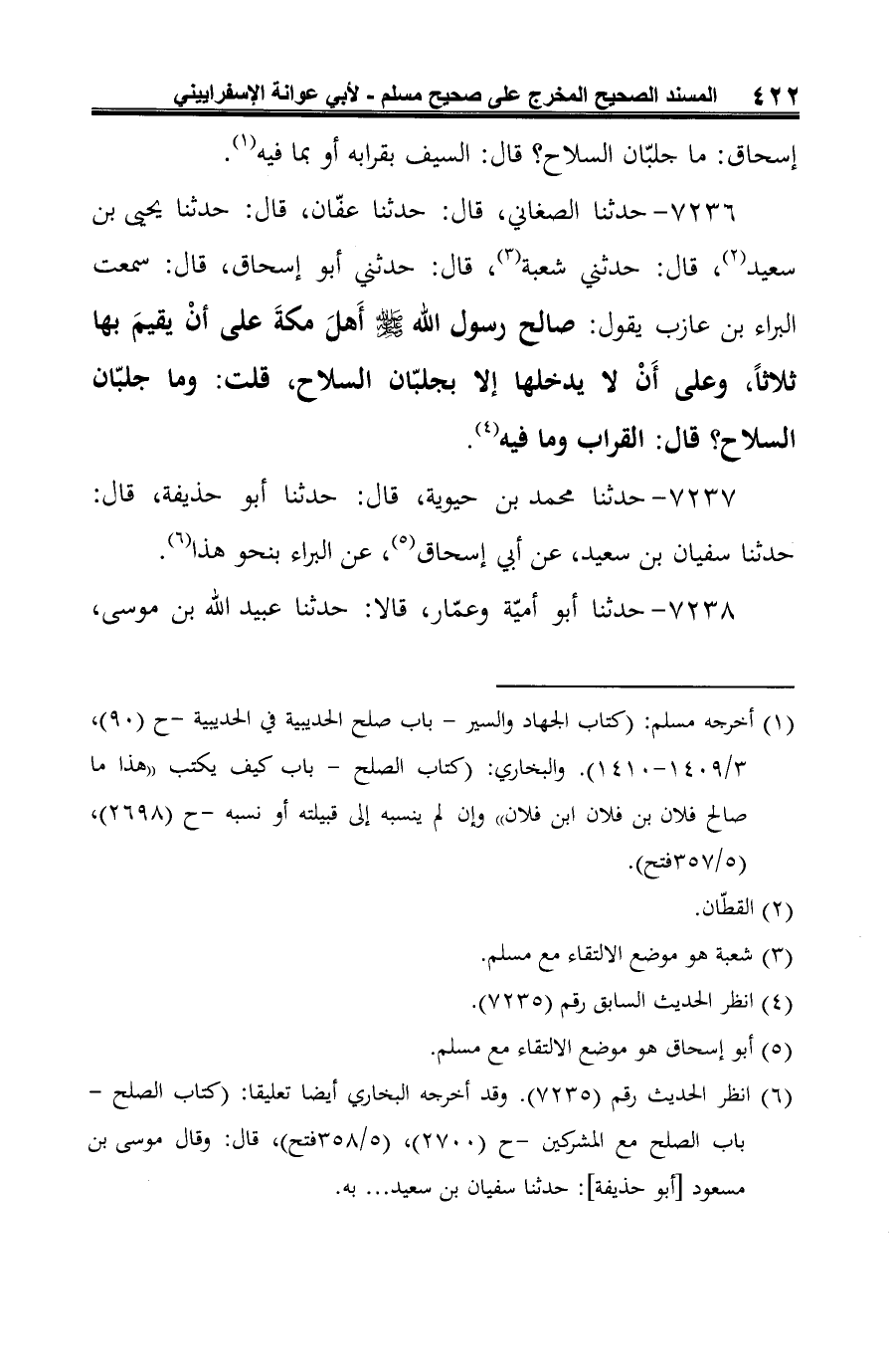 7236 - حدثنا الصغاني، قال: حدثنا عفّان، قال: حدثنا يحيى بن سعيد (¬1)، قال: حدثني شعبة (¬2)، قال: حدثني أبو إسحاق، قال: سمعت البراء بن عازب يقول: صالح رسول الله -صلى الله عليه وسلم- أَهلَ مكةَ على أنْ يقيمَ بها ثلاثًا، وعلى أَنْ لا يدخلها إلا بجلبّان السلاح، قلت: وما جلبّان السلاح؟ قال: القراب وما فيه (¬3).