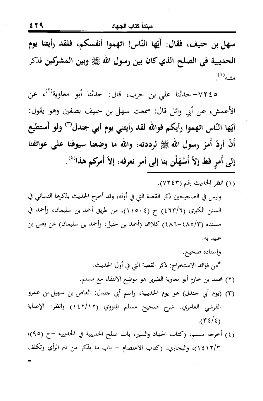 7245 - حدثنا علي بن حرب، قال: حدثنا أبو معاوية (¬1)، عن الأعمش، عن أبي وائل قال: سمعت سهل بن حنيف بصفين وهو يقول: أيّها النّاس اتهموا رأيكم فوالله لقد رأيتني يوم أبي جندل (¬2) ولو أَستطيع أَنْ أردّ أَمرَ رسول الله -صلى الله عليه وسلم- لرددته، والله ما وضعنا سيوفنا على عواتقنا إلى أَمرٍ قط إلّا أَسْهَلْن بنا إلى أمر نعرفه، إلّا أَمركم هذا (¬3).
