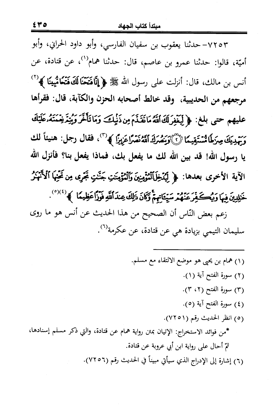 7253 - حدثنا يعقوب بن سفيان الفارسي، وأبو داود الحراني، وأبو أميّة، قالوا: حدثنا عمرو بن عاصم، قال: حدثنا همام (¬1)، عن قتادة، عن أنس بن مالك، قال: أنزلت على رسول الله -صلى الله عليه وسلم- {إِنَّا فَتَحْنَا لَكَ فَتْحًا مُبِينًا} (¬2) مرجعهم من الحديبية، وقد خالط أصحابه الحزن والكآبة، قال: فقرأها عليهم حتى بلغ: {لِيَغْفِرَ لَكَ اللَّهُ مَا تَقَدَّمَ مِنْ ذَنْبِكَ وَمَا تَأَخَّرَ وَيُتِمَّ نِعْمَتَهُ عَلَيْكَ وَيَهْدِيَكَ صِرَاطًا مُسْتَقِيمًا (2) وَيَنْصُرَكَ اللَّهُ نَصْرًا عَزِيزًا} (¬3)، فقال رجل: هنيئًا لك يا رسول الله! قد بين الله لك ما يفعل بك، فماذا يفعل بنا؟ فأنزل الله الآية الأخرى بعدها: {لِيُدْخِلَ الْمُؤْمِنِينَ وَالْمُؤْمِنَاتِ جَنَّاتٍ تَجْرِي مِنْ تَحْتِهَا الْأَنْهَارُ خَالِدِينَ فِيهَا وَيُكَفِّرَ عَنْهُمْ سَيِّئَاتِهِمْ وَكَانَ ذَلِكَ عِنْدَ اللَّهِ فَوْزًا عَظِيمًا} (¬4) (¬5).
