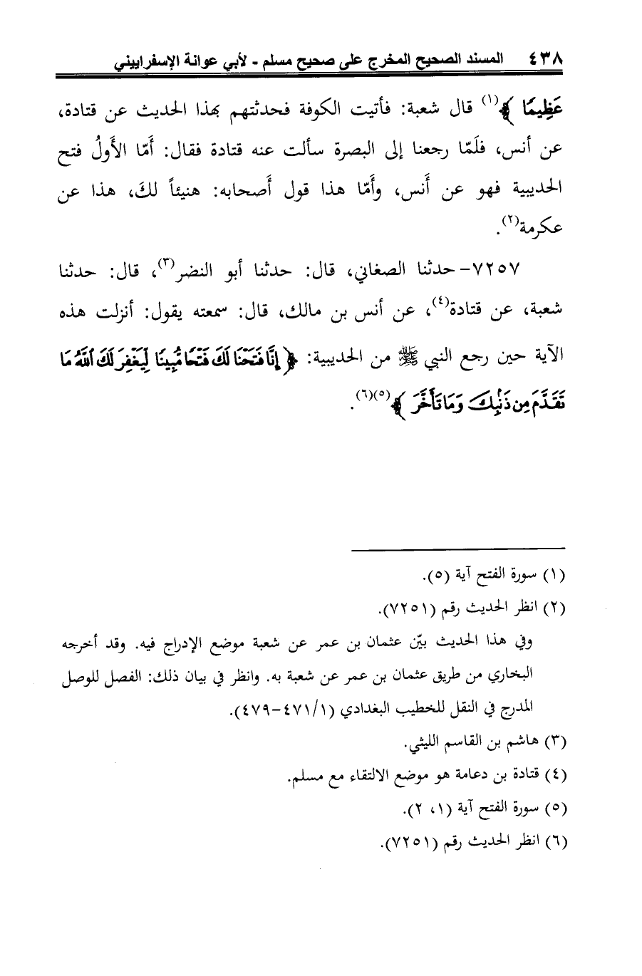 7257 - حدثنا الصغاني، قال: حدثنا أبو النضر (¬1)، قال: حدثنا شعبة، عن قتادة (¬2)، عن أنس بن مالك، قال: سمعته يقول: أنزلت هذه الآية حين رجع النبي -صلى الله عليه وسلم- من الحديبية: {لِيَغْفِرَ لَكَ اللَّهُ مَا تَقَدَّمَ مِنْ ذَنْبِكَ وَمَا تَأَخَّرَ} (¬3) (¬4).