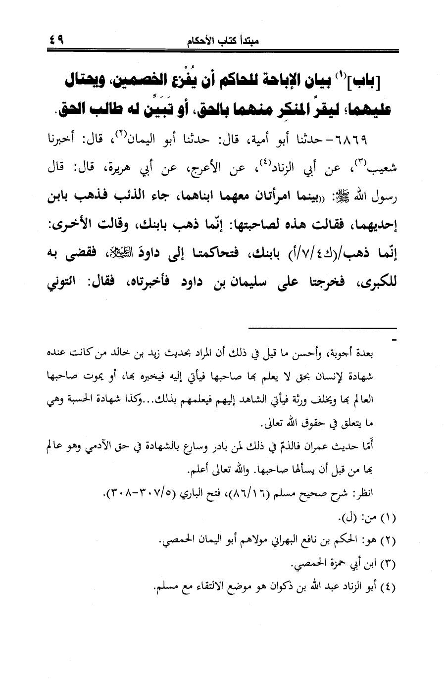 (¬6) أخرجه مسلم: (كتاب الأقضية -باب بيان اختلاف المجتهدين - ح (20)، 3/ 1344). وفيه "أشقه بينكما" بدل قوله "أشقه بينهما".