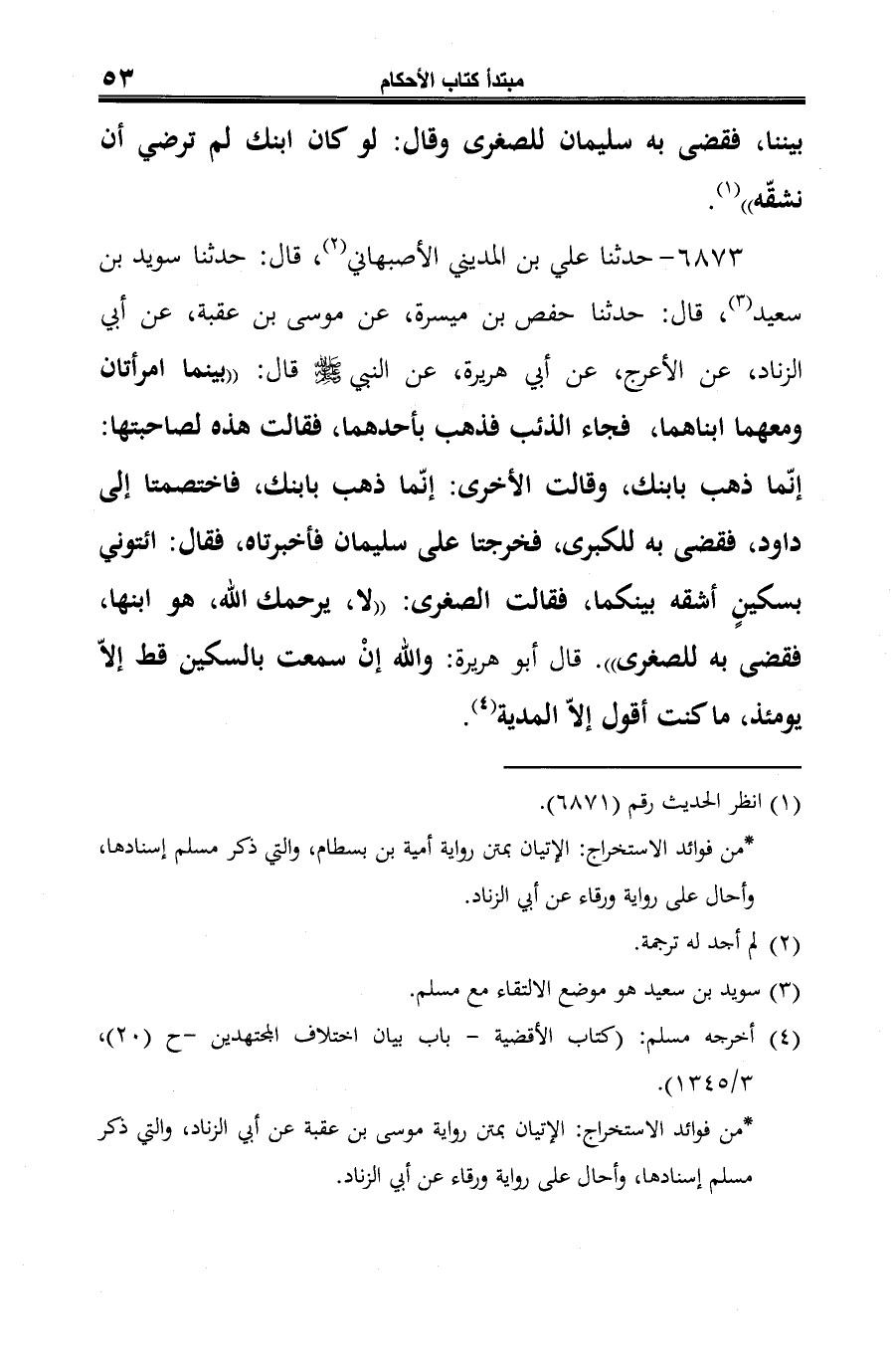 6873 - حدثنا علي بن المديني الأصبهاني (¬1)، قال: حدثنا سويد بن سعيد (¬2)، قال: حدثنا حفص بن ميسرة، عن موسى بن عقبة، عن أبي الزناد، عن الأعرج، عن أبي هريرة، عن النبي -صلى الله عليه وسلم- قال: "بينما امرأتان ومعهما ابناهما، فجاء الذئب فذهب بأحدهما، فقالت هذه لصاحبتها: إنّما ذهب بابنك، وقالت الأخرى: إنّما ذهب بابنك، فاختصمتا إلى داود، فقضى به للكبرى، فخرجتا على سليمان فأخبرتاه، فقال: ائتوني بسكينٍ أشقه بينكما، فقالت الصغرى: "لا، يرحمك الله، هو ابنها، فقضى به للصغرى". قال أبو هريرة: والله إنْ سمعت بالسكين قط إلّا يومئذ، ما كنت أقول إلّا المدية (¬3).