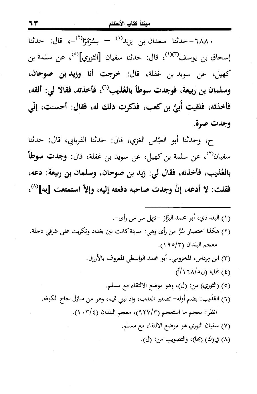 6880 - حدثنا سعدان بن يزيد (¬1) -بسُرّمَرّا (¬2) -، قال: حدثنا إسحاق بن يوسف (¬3) (¬4)، قال: حدثنا سفيان [الثوري] (¬5)، عن سلمة بن كهيل، عن سويد بن غفلة، قال: خرجت أنا وزيد بن صوحان، وسلمان بن ربيعة، فوجدت سوطًا بالعُذيب (¬6)، فأخذته، فقالا لي: ألقه، فأخذته، فلقيت أُبي بن كعب، فذكرت ذلك له، فقال: أحسنت، إنّي وجدت صرة.