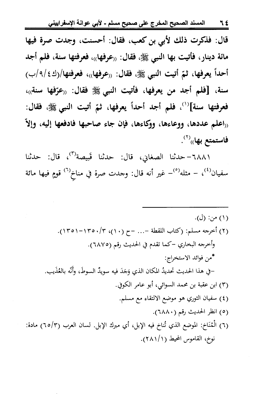 6881 - حدثنا الصغاني، قال: حدثنا قَبيصة (¬1)، قال: حدثنا سفيان (¬2)، -مثله (¬3) - غير أنه قال: وجدت صرة في مناخِ (¬4) قومٍ فيها مائة