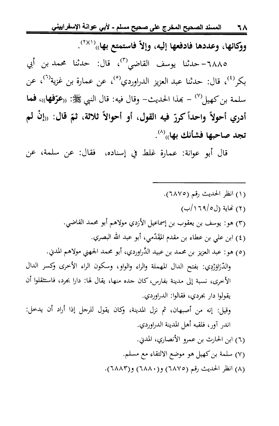 6885 - حدثنا يوسف القاضي (¬1)، قال: حدثنا محمد بن أبي بكر (¬2)، قال: حدثنا عبد العزيز الدراوردي (¬3)، عن عمارة بن غزية (¬4)، عن سلمة بن كهيل (¬5) -بهذا الحديث- وقال فيه: قال النبي -صلى الله عليه وسلم-: "عرّفها"، فما أدري أحولًا واحدًا كرّر فيه القول، أو أحوالًا ثلاثة، ثمّ قال: "إنْ لم تجد صاحبها فشأنك بها" (¬6).