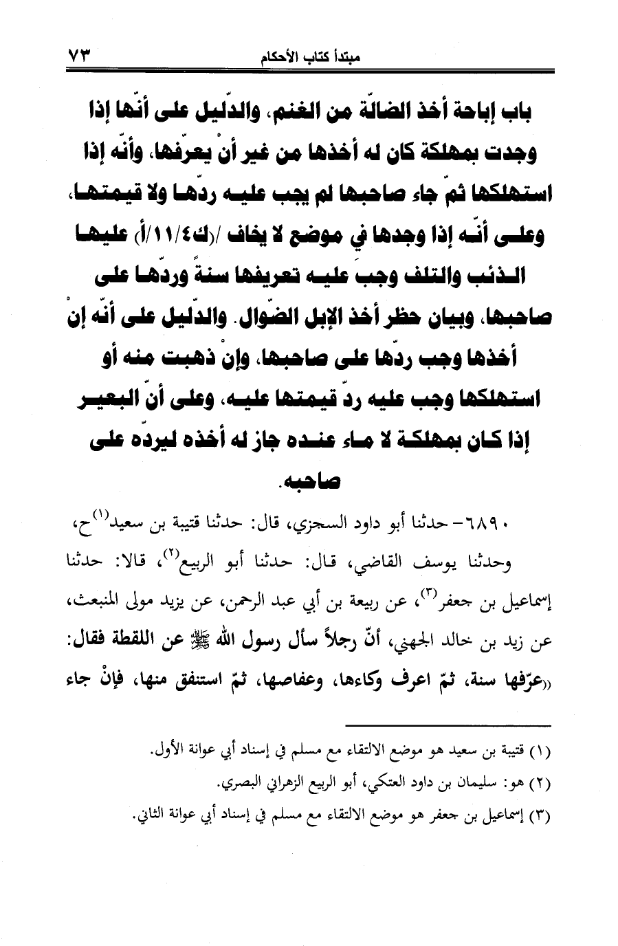 باب إباحة أخذ الضالّة من الغنم، والدليل على أنّها إذا وجدت بمهلكة كان له أخذها من غير أنْ يعرّفها، وأنّه إذا استهلكها ثمّ جاء صاحبها لم يجب عليه ردّها ولا قيمتها، وعلى أنّه إذا وجدها في موضع لا يخاف عليها الذئب والتلف وجب عليه تعريفها سنةً وردّها على صاحبها، وبيان حظر أخذ الإبل الضّوال. والدليل على أنّه إنْ أخذها وجب ردّها على صاحبها، وإن ذهبت منه أو استهلكها وجب عليه ردّ قيمتها عليه، وعلى أنّ البعير إذا كان بمهلكة لا ماء عنده جاز له أخذه ليردّه على صاحبه