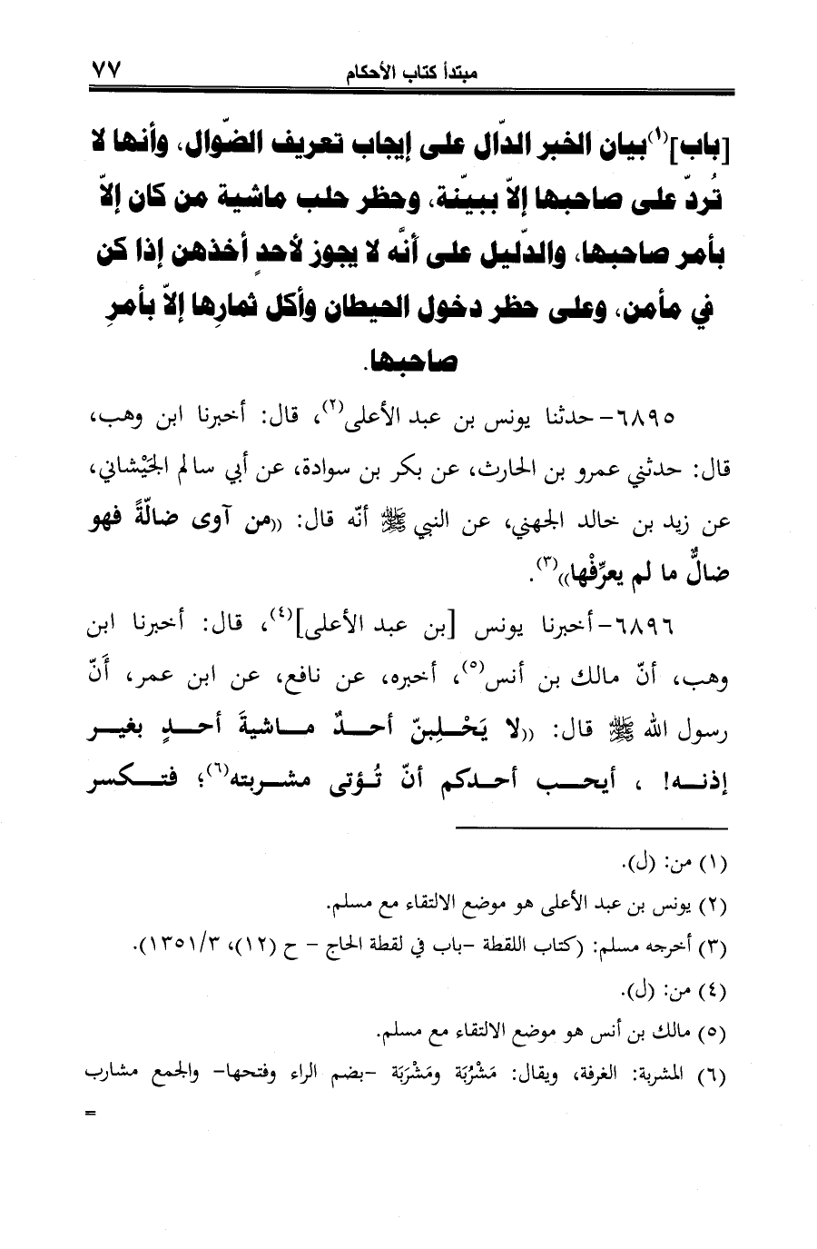 (¬5) أخرجه مسلم: (كتاب اللقطة -باب تحريم حلب الماشية بغير إذن مالكها - ح (13)، 3/ 1352)، وأخرجه البخاري: (كتاب اللقطة -باب لا تحتلب ماشية أحد بغير إذنه - ح (2435)، (5/ 106 - 107 فتح).