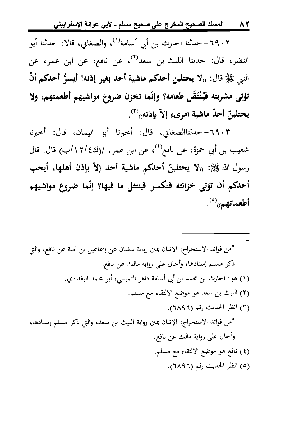 6902 - حدثنا الحارث بن أبي أسامة (¬1)، والصغاني، قالا: حدثنا أبو النضر، قال: حدثنا الليث بن سعد (¬2)، عن نافع، عن ابن عمر، عن النبي -صلى الله عليه وسلم- قال: "لا يحتلبن أحدكم ماشية أحد بغير إذنه! أيسرُّ أحدكم أنْ تؤتى مشربته فيُنْتَقَل طعامه؟ وإنّما تخزن ضروع مواشيهم أطعمتهم، ولا يحتلبنّ أحدٌ ماشية امرئ إلّا بإذنه" (¬3).