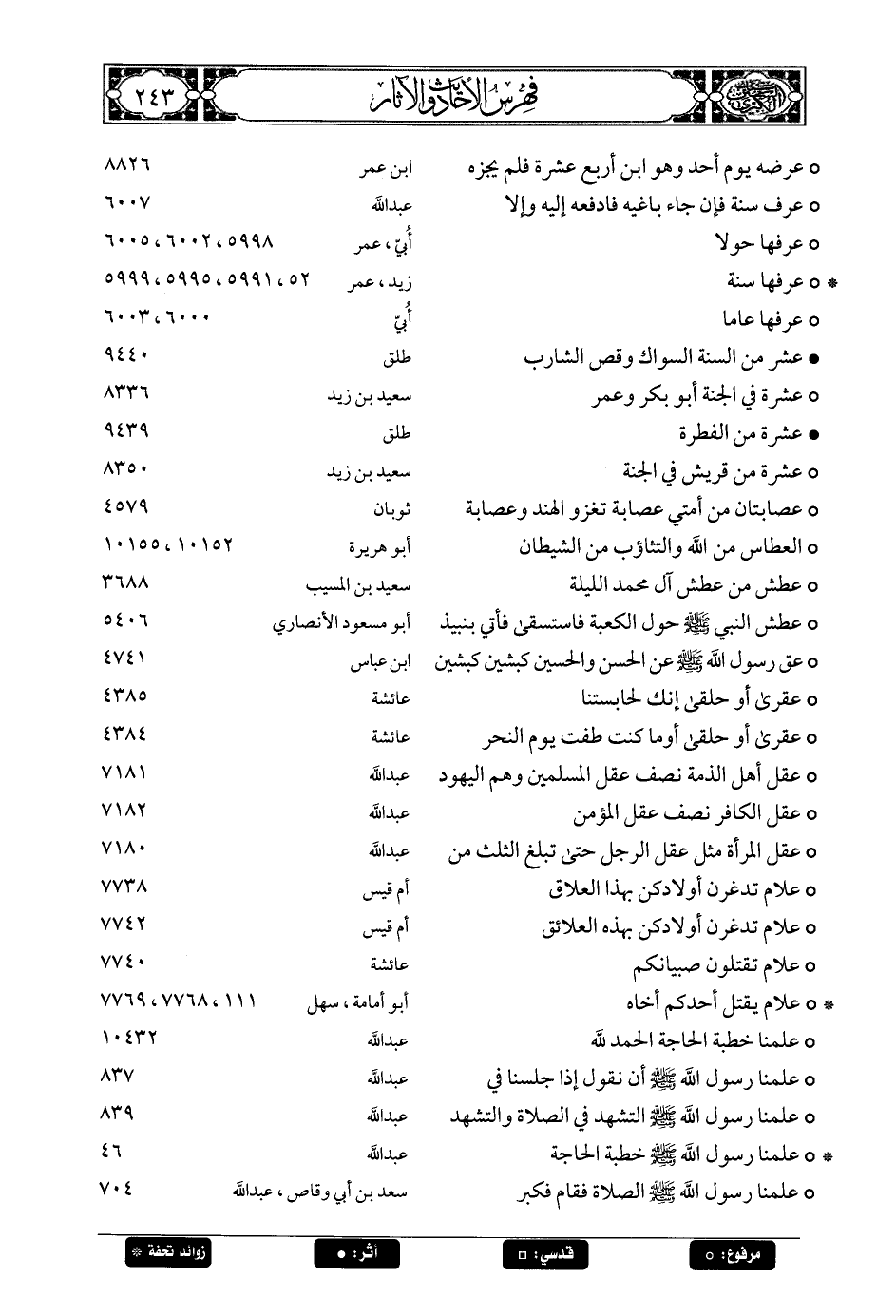 243 - حديث: عن توبة العنبري قال: أرسلني صالح بن عبد الرحمن إلى سليمان، فقدمت فقلت لعمر بن عبد العزيز: هل لك حاجة إلى صالح بن عبد الرحمن؟ فقال: قل له: عليك بالذي يبقى لك عند الله، فإن ما بقي عند الله بقي عند الناس، وما لم يبق عند الله لم يبق عند الناس.