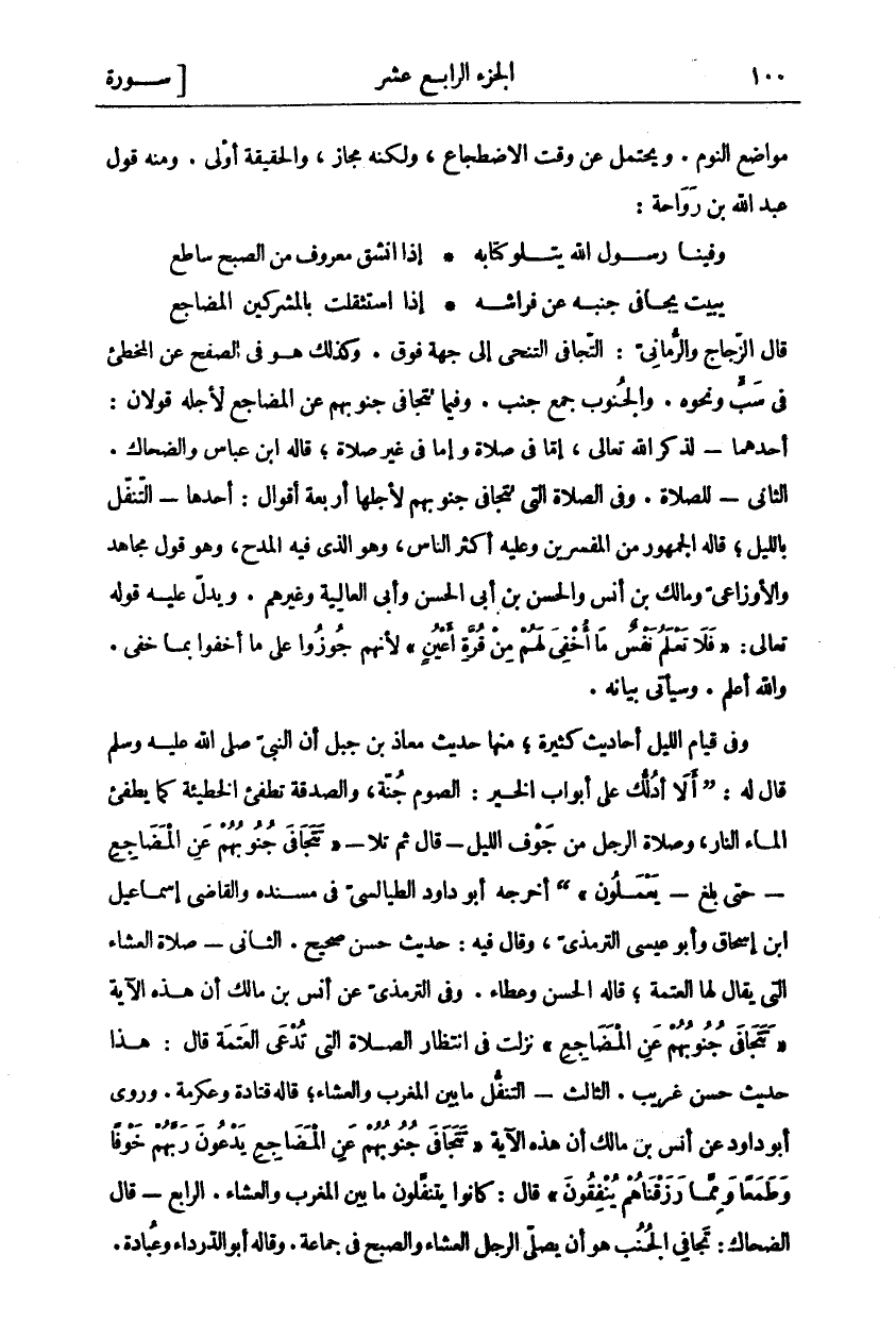قَالَ الزَّجَّاجُ وَالرُّمَّانِيُّ: التَّجَافِي التَّنَحِّي إِلَى جِهَةٍ فَوْقَ. وَكَذَلِكَ هُوَ فِي الصَّفْحِ عَنِ الْمُخْطِئِ فِي سَبٍّ وَنَحْوِهِ. وَالْجُنُوبُ جَمْعُ جَنْبٍ. وَفِيمَا تَتَجَافَى جُنُوبُهُمْ عَنِ الْمَضَاجِعِ لِأَجْلِهِ قَوْلَانِ: أَحَدُهُمَا- لِذِكْرِ اللَّهِ تَعَالَى، إِمَّا فِي صَلَاةٍ وَإِمَّا فِي غَيْرِ صَلَاةٍ، قَالَهُ ابْنُ عَبَّاسٍ وَالضَّحَّاكُ. الثَّانِي- لِلصَّلَاةِ. وَفِي الصَّلَاةِ الَّتِي تَتَجَافَى جُنُوبُهُمْ لِأَجْلِهَا أَرْبَعَةُ أَقْوَالٍ: أَحَدُهَا- التَّنَفُّلُ بِاللَّيْلِ، قَالَهُ الْجُمْهُورُ مِنَ الْمُفَسِّرِينَ وَعَلَيْهِ أَكْثَرُ النَّاسِ، وَهُوَ الَّذِي فِيهِ الْمَدْحُ، وَهُوَ قَوْلُ مُجَاهِدٍ وَالْأَوْزَاعِيِّ وَمَالِكِ بْنِ أَنَسٍ وَالْحَسَنِ بْنِ أَبِي الْحَسَنِ وَأَبِي الْعَالِيَةِ وَغَيْرِهِمْ. وَيَدُلُّ عَلَيْهِ قَوْلُهُ تَعَالَى:" فَلا تَعْلَمُ نَفْسٌ مَا أُخْفِيَ لَهُمْ مِنْ قُرَّةِ أَعْيُنٍ" [السجدة: ١٧] لِأَنَّهُمْ جُوزُوا عَلَى مَا أَخْفَوْا بِمَا خَفِيَ. وَاللَّهُ أَعْلَمُ. وَسَيَأْتِي بَيَانُهُ. وَفِي قِيَامِ اللَّيْلِ أَحَادِيثُ كَثِيرَةٌ، مِنْهَا حَدِيثُ مُعَاذِ بْنِ جَبَلٍ أَنَّ النَّبِيَّ صَلَّى اللَّهُ عَلَيْهِ وَسَلَّمَ قَالَ لَهُ: (أَلَا أَدُلُّكَ عَلَى أَبْوَابِ الْخَيْرِ: الصَّوْمُ جُنَّةٌ، وَالصَّدَقَةُ تُطْفِئُ الْخَطِيئَةَ كَمَا يُطْفِئُ الْمَاءُ النَّارَ، وَصَلَاةُ الرَّجُلِ مِنْ جَوْفِ اللَّيْلِ- قَالَ ثُمَّ تَلَا-" تَتَجافى جُنُوبُهُمْ عَنِ الْمَضاجِعِ"- حَتَّى بَلَغَ-" يَعْمَلُونَ" (أَخْرَجَهُ أَبُو دَاوُدَ الطَّيَالِسِيُّ فِي مسنده والقاضي إسماعيل ابن إِسْحَاقَ وَأَبُو عِيسَى التِّرْمِذِيُّ، وَقَالَ فِيهِ: حَدِيثٌ حَسَنٌ صَحِيحٌ. الثَّانِي: صَلَاةُ الْعِشَاءِ الَّتِي يُقَالُ لَهَا الْعَتَمَةُ، قَالَهُ الْحَسَنُ وَعَطَاءٌ. وَفِي التِّرْمِذِيِّ عَنْ أَنَسِ بْنِ مَالِكٍ أَنَّ هَذِهِ الْآيَةَ" تَتَجافى جُنُوبُهُمْ عَنِ الْمَضاجِعِ" نَزَلَتْ فِي انْتِظَارِ الصَّلَاةِ الَّتِي تُدْعَى الْعَتَمَةَ قَالَ: هَذَا حَدِيثٌ حَسَنٌ غَرِيبٌ. الثَّالِثُ- التَّنَفُّلُ مَا بَيْنَ الْمَغْرِبِ وَالْعِشَاءِ، قَالَهُ قَتَادَةُ وَعِكْرِمَةُ. وَرَوَى أَبُو دَاوُدَ عَنْ أَنَسِ بْنِ مَالِكٍ أَنَّ هَذِهِ الْآيَةَ" تَتَجافى جُنُوبُهُمْ عَنِ الْمَضاجِعِ يَدْعُونَ رَبَّهُمْ خَوْفاً وَطَمَعاً وَمِمَّا رَزَقْناهُمْ يُنْفِقُونَ" قَالَ: كَانُوا يَتَنَفَّلُونَ بَيْنَ الْمَغْرِبِ وَالْعِشَاءِ. الرَّابِعُ- قَالَ الضَّحَّاكُ: تَجَافِي الْجَنْبِ هُوَ أَنْ يُصَلِّيَ الرَّجُلُ الْعِشَاءَ وَالصُّبْحَ فِي جَمَاعَةٍ. وَقَالَهُ أَبُو الدَّرْدَاءِ وَعُبَادَةُ.