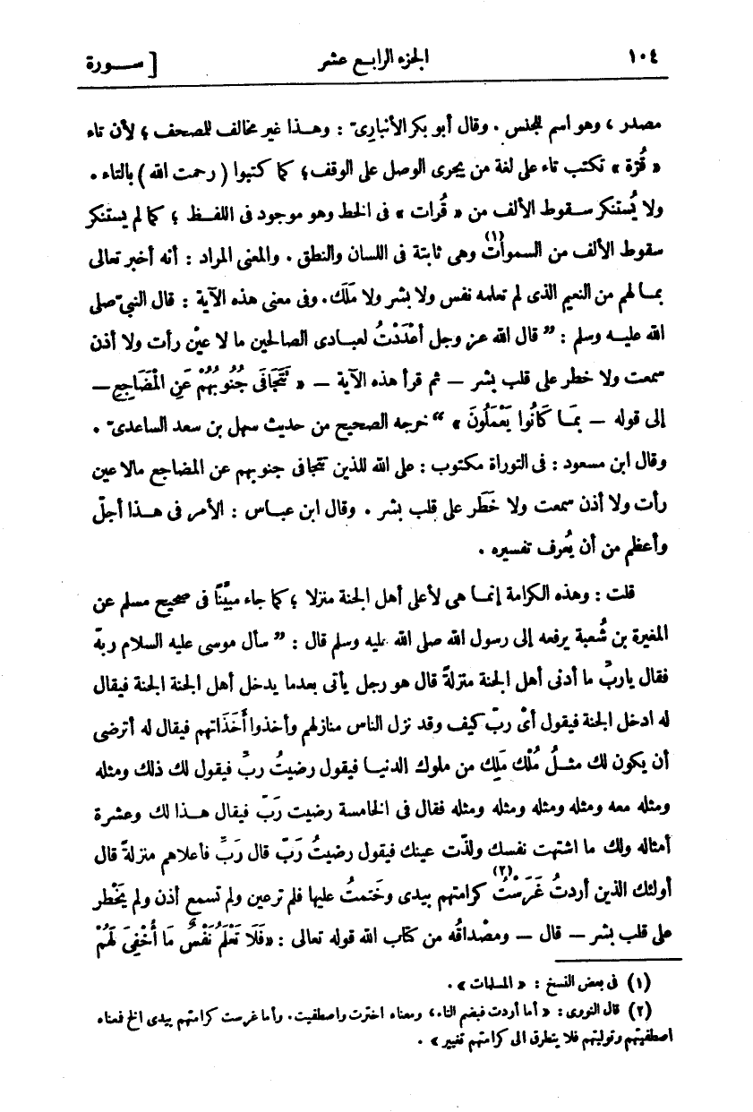 مَصْدَرٌ، وَهُوَ اسْمٌ لِلْجِنْسِ. وَقَالَ أَبُو بَكْرٍ الْأَنْبَارِيُّ: وَهَذَا غَيْرُ مُخَالِفٍ لِلْمُصْحَفِ، لِأَنَّ تَاءَ" قُرَّةِ" تكتب تاء لُغَةِ مَنْ يُجْرِي الْوَصْلَ عَلَى الْوَقْفِ، كَمَا كَتَبُوا (رَحْمَتَ اللَّهِ) بِالتَّاءِ. وَلَا يُسْتَنْكَرُ سُقُوطُ الْأَلِفِ مِنْ" قُرَّاتِ" فِي الْخَطِّ وَهُوَ مَوْجُودٌ فِي اللَّفْظِ، كَمَا لَمْ يُسْتَنْكَرْ سُقُوطُ الْأَلِفِ مِنَ السَّمَاوَاتِ «١» وَهِيَ ثَابِتَةٌ فِي اللِّسَانِ وَالنُّطْقِ. وَالْمَعْنَى الْمُرَادُ: أَنَّهُ أَخْبَرَ تَعَالَى بِمَا لَهُمْ مِنَ النَّعِيمِ الَّذِي لَمْ تَعْلَمْهُ نَفْسٌ وَلَا بَشَرٌ وَلَا مَلَكٌ. وَفِي مَعْنَى هَذِهِ الْآيَةُ: قَالَ النَّبِيُّ صَلَّى اللَّهُ عَلَيْهِ وَسَلَّمَ: (قَالَ اللَّهُ عز وجل أعدت لِعِبَادِي الصَّالِحِينَ مَا لَا عَيْنٌ رَأَتْ وَلَا أُذُنٌ سَمِعَتْ وَلَا خَطَرَ عَلَى قَلْبِ بَشَرٍ- ثُمَّ قَرَأَ هَذِهِ الْآيَةَ-" تَتَجافى جُنُوبُهُمْ عَنِ الْمَضاجِعِ- إِلَى قَوْلِهِ-" بِما كانُوا يَعْمَلُونَ" (خَرَّجَهُ الصَّحِيحُ مِنْ حَدِيثِ سَهْلِ بْنِ سَعْدٍ السَّاعِدِيِّ. وَقَالَ ابْنُ مَسْعُودٍ: فِي التَّوْرَاةِ مَكْتُوبٌ: عَلَى اللَّهِ لِلَّذِينَ تَتَجَافَى جُنُوبُهُمْ عَنِ الْمَضَاجِعِ مَا لَا عَيْنٌ رَأَتْ وَلَا أُذُنٌ سَمِعَتْ وَلَا خَطَرَ عَلَى قَلْبِ بَشَرٍ. وَقَالَ ابْنُ عَبَّاسٍ: الْأَمْرُ فِي هَذَا أَجَلُّ وَأَعْظَمُ مِنْ أَنْ يُعْرَفَ تَفْسِيرُهُ. قُلْتُ: وَهَذِهِ الْكَرَامَةُ إِنَّمَا هِيَ لِأَعْلَى أَهْلِ الْجَنَّةِ مَنْزِلًا، كَمَا جَاءَ مُبَيَّنًا فِي صَحِيحِ مُسْلِمٍ عَنِ الْمُغِيرَةِ بْنِ شُعْبَةَ يَرْفَعُهُ إِلَى رَسُولِ اللَّهِ صَلَّى اللَّهُ عَلَيْهِ وَسَلَّمَ قَالَ: (سَأَلَ مُوسَى عَلَيْهِ السَّلَامُ رَبَّهُ فَقَالَ يَا رَبِّ مَا أَدْنَى أَهْلِ الْجَنَّةِ منزلة قال هو رجل يأتي بعد ما يَدْخُلُ أَهْلُ الْجَنَّةِ الْجَنَّةَ فَيُقَالُ لَهُ ادْخُلِ الْجَنَّةَ فَيَقُولُ أَيْ رَبِّ كَيْفَ وَقَدْ نَزَلَ النَّاسُ مَنَازِلَهُمْ وَأَخَذُوا أَخَذَاتِهِمْ فَيُقَالُ لَهُ أَتَرْضَى أَنْ يَكُونَ لَكَ مِثْلُ مُلْكِ مَلِكٍ مِنْ مُلُوكِ الدُّنْيَا فَيَقُولُ رَضِيَتُ رَبِّ فَيَقُولُ لَكَ ذلك ومثله ومثله معه وَمِثْلُهُ وَمِثْلُهُ وَمِثْلُهُ وَمِثْلُهُ فَقَالَ فِي الْخَامِسَةِ رَضِيَتُ رَبِّ فَيُقَالُ هَذَا لَكَ وَعَشَرَةُ أَمْثَالِهِ وَلَكَ مَا اشْتَهَتْ نَفْسُكَ وَلَذَّتْ عَيْنُكَ فَيَقُولُ رَضِيَتُ رَبِّ قَالَ رَبِّ فَأَعْلَاهُمْ مَنْزِلَةً قَالَ أُولَئِكَ الَّذِينَ أَرَدْتُ غَرَسْتُ «٢» كَرَامَتَهُمْ بِيَدِي وَخَتَمْتُ عَلَيْهَا فَلَمْ تَرَ عَيْنٌ وَلَمْ تَسْمَعْ أُذُنٌ وَلَمْ يَخْطُرْ عَلَى قَلْبِ بَشَرٍ- قَالَ- وَمِصْدَاقُهُ مِنْ كِتَابِ اللَّهِ قَوْلُهُ تَعَالَى:" فَلا تَعْلَمُ نَفْسٌ مَا أُخْفِيَ لَهُمْ مِنْ قُرَّةِ أَعْيُنٍ جَزاءً بِما كانُوا يَعْمَلُونَ"