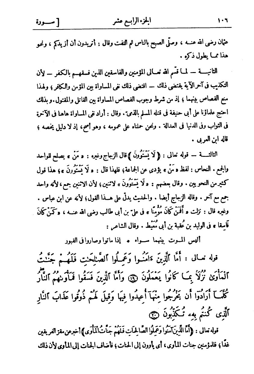 عُثْمَانَ رَضِيَ اللَّهُ عَنْهُ، وَصَلَّى الصُّبْحَ بِالنَّاسِ ثُمَّ الْتَفَتَ وَقَالَ: أَتُرِيدُونَ أَنْ أَزِيدَكُمْ، وَنَحْوَ هَذَا مِمَّا يَطُولُ ذِكْرُهُ. الثَّانِيَةُ- لَمَّا قَسَّمَ اللَّهُ تَعَالَى الْمُؤْمِنِينَ وَالْفَاسِقِينَ الَّذِينَ فَسَّقَهُمْ بِالْكُفْرِ- لِأَنَّ التَّكْذِيبَ فِي آخِرِ الْآيَةِ يَقْتَضِي ذَلِكَ- اقْتَضَى ذَلِكَ نَفْيَ الْمُسَاوَاةِ بَيْنَ الْمُؤْمِنِ وَالْكَافِرِ، وَلِهَذَا مُنِعَ الْقِصَاصُ بَيْنَهُمَا، إِذْ مِنْ شَرْطِ وُجُوبِ الْقِصَاصِ الْمُسَاوَاةُ بَيْنَ الْقَاتِلِ وَالْمَقْتُولِ. وَبِذَلِكَ احْتَجَّ عُلَمَاؤُنَا عَلَى أَبِي حَنِيفَةَ فِي قَتْلِهِ المسلم بالذمي. وقال: أراد نفي المساواة ها هنا فِي الْآخِرَةِ فِي الثَّوَابِ وَفِي الدُّنْيَا فِي الْعَدَالَةِ. وَنَحْنُ حَمَلْنَاهُ عَلَى عُمُومِهِ، وَهُوَ أَصَحُّ، إِذْ لَا دَلِيلَ يَخُصُّهُ، قَالَهُ ابْنُ الْعَرَبِيِّ. الثَّالِثَةُ- قَوْلُهُ تَعَالَى: (لَا يَسْتَوُونَ) قَالَ الزَّجَّاجُ وَغَيْرُهُ:" مَنْ" يَصْلُحُ لِلْوَاحِدِ وَالْجَمْعِ. النَّحَّاسُ: لَفْظُ" مَنْ" يُؤَدِّي عَنِ الْجَمَاعَةِ، فَلِهَذَا قَالَ:" لَا يَسْتَوُونَ"، هَذَا قَوْلُ كَثِيرٍ مِنَ النَّحْوِيِّينَ. وَقَالَ بَعْضُهُمْ:" لَا يَسْتَوُونَ" لِاثْنَيْنِ، لِأَنَّ الِاثْنَيْنِ جَمْعٌ، لِأَنَّهُ وَاحِدٌ جُمِعَ مَعَ آخَرَ. وَقَالَهُ الزَّجَّاجُ أَيْضًا. وَالْحَدِيثُ يَدُلُّ عَلَى هَذَا الْقَوْلِ، لِأَنَّهُ عَنِ ابْنِ عَبَّاسٍ. وَغَيْرِهِ قَالَ: نَزَلَتْ" أَفَمَنْ كانَ مُؤْمِناً" فِي عَلِيِّ بْنِ أَبِي طَالِبٍ رَضِيَ اللَّهُ عَنْهُ،" كَمَنْ كانَ فاسِقاً" فِي الْوَلِيدِ بْنِ عُقْبَةَ بْنِ أَبِي مُعَيْطٍ. وَقَالَ الشَّاعِرُ: