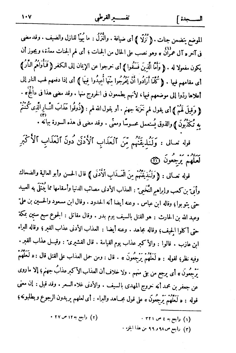 قَوْلُهُ تَعَالَى: (وَلَنُذِيقَنَّهُمْ مِنَ الْعَذابِ الْأَدْنى) قَالَ الْحَسَنُ وَأَبُو الْعَالِيَةِ وَالضَّحَّاكُ وَأُبَيُّ بْنُ كَعْبٍ وَإِبْرَاهِيمُ النَّخَعِيُّ: الْعَذَابُ الْأَدْنَى مَصَائِبُ الدُّنْيَا وَأَسْقَامُهَا مِمَّا يُبْتَلَى بِهِ الْعَبِيدُ حَتَّى يَتُوبُوا، وَقَالَهُ ابْنُ عَبَّاسٍ. وَعَنْهُ أَيْضًا أَنَّهُ الْحُدُودُ. وَقَالَ ابْنُ مَسْعُودٍ وَالْحُسَيْنُ بْنُ عَلِيٍّ وَعَبْدُ اللَّهِ بْنُ الْحَارِثِ: هُوَ الْقَتْلُ بِالسَّيْفِ يَوْمَ بَدْرٍ. وَقَالَ مُقَاتِلٌ: الْجُوعُ سَبْعَ سِنِينَ بِمَكَّةَ حَتَّى أَكَلُوا الْجِيَفَ، وَقَالَهُ مُجَاهِدٌ. وَعَنْهُ أَيْضًا: الْعَذَابُ الْأَدْنَى عَذَابُ الْقَبْرِ، وَقَالَهُ الْبَرَاءُ ابن عَازِبٍ. قَالُوا: وَالْأَكْبَرُ عَذَابُ يَوْمِ الْقِيَامَةِ. قَالَ الْقُشَيْرِيُّ: وَقِيلَ عَذَابُ الْقَبْرِ. وَفِيهِ نَظَرٌ، لِقَوْلِهِ:" لَعَلَّهُمْ يَرْجِعُونَ". قَالَ: وَمَنْ حَمَلَ الْعَذَابَ عَلَى الْقَتْلِ قَالَ:" لَعَلَّهُمْ يَرْجِعُونَ" أَيْ يَرْجِعُ مَنْ بَقِيَ مِنْهُمْ. وَلَا خِلَافَ أَنَّ الْعَذَابَ الْأَكْبَرَ عَذَابُ جَهَنَّمَ، إِلَّا مَا رُوِيَ عَنْ جَعْفَرِ بْنِ مُحَمَّدٍ أَنَّهُ خُرُوجُ الْمَهْدِيِّ بِالسَّيْفِ. وَالْأَدْنَى غَلَاءُ السِّعْرِ. وَقَدْ قِيلَ: إِنَّ مَعْنَى قَوْلِهِ:" لَعَلَّهُمْ يَرْجِعُونَ". عَلَى قَوْلِ مُجَاهِدٍ وَالْبَرَاءِ: أَيْ لعلهم يريدون الرجوع ويطلبونه