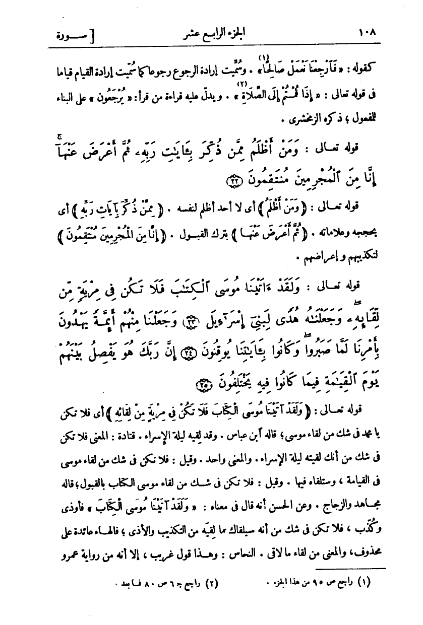 وَلَقَدْ آتَيْنا مُوسَى الْكِتابَ فَلا تَكُنْ فِي مِرْيَةٍ مِنْ لِقائِهِ وَجَعَلْناهُ هُدىً لِبَنِي إِسْرائِيلَ (٢٣) وَجَعَلْنا مِنْهُمْ أَئِمَّةً يَهْدُونَ بِأَمْرِنا لَمَّا صَبَرُوا وَكانُوا بِآياتِنا يُوقِنُونَ (٢٤) إِنَّ رَبَّكَ هُوَ يَفْصِلُ بَيْنَهُمْ يَوْمَ الْقِيامَةِ فِيما كانُوا فِيهِ يَخْتَلِفُونَ (٢٥)