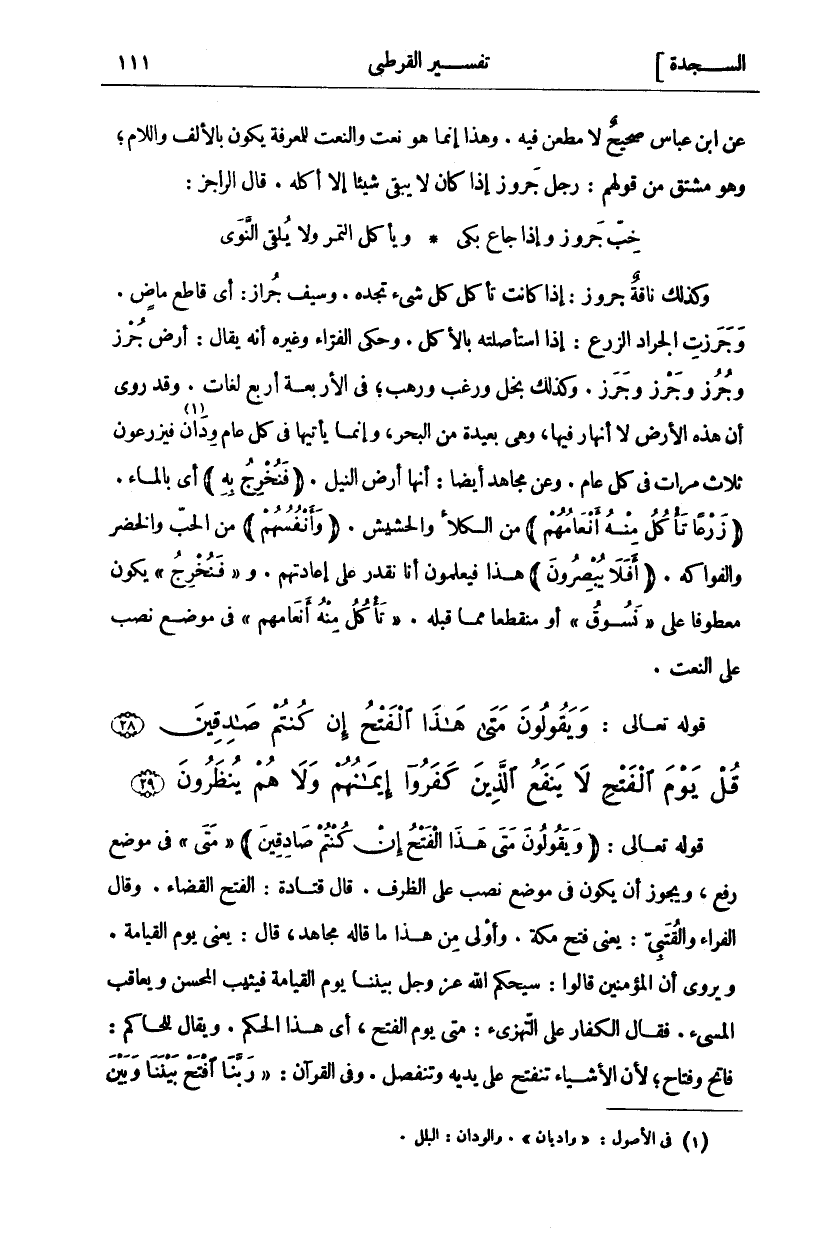 قَوْلُهُ تَعَالَى: (وَيَقُولُونَ مَتى هذَا الْفَتْحُ إِنْ كُنْتُمْ صادِقِينَ) " مَتى " فِي مَوْضِعِ رَفْعٍ، وَيَجُوزُ أَنْ يَكُونَ فِي مَوْضِعِ نَصْبٍ عَلَى الظَّرْفِ. قَالَ قَتَادَةُ: الْفَتْحُ الْقَضَاءُ. وَقَالَ الْفَرَّاءُ وَالْقُتَبِيُّ: يَعْنِي فَتْحَ مَكَّةَ. وَأَوْلَى مِنْ هَذَا مَا قَالَهُ مُجَاهِدٌ، قَالَ: يَعْنِي يَوْمَ الْقِيَامَةِ. وَيُرْوَى أَنَّ الْمُؤْمِنِينَ قَالُوا: سَيَحْكُمُ اللَّهُ عَزَّ وَجَلَّ بَيْنَنَا يَوْمَ الْقِيَامَةِ فَيُثِيبُ الْمُحْسِنَ وَيُعَاقِبُ الْمُسِيءَ. فَقَالَ الْكُفَّارُ عَلَى التَّهَزِّئِ. مَتَى يَوْمُ الْفَتْحِ، أَيْ هَذَا الْحُكْمُ. وَيُقَالُ لِلْحَاكِمِ: فَاتِحٌ وَفَتَّاحٌ، لِأَنَّ الْأَشْيَاءَ تَنْفَتِحُ على يديه وتنفصل. وفي القرآن:"