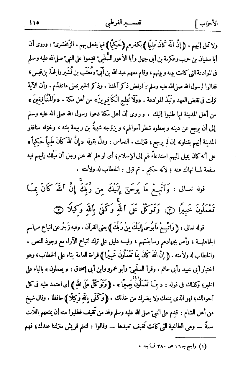 قَوْلُهُ تَعَالَى: (وَاتَّبِعْ مَا يُوحى إِلَيْكَ مِنْ رَبِّكَ) يَعْنِي الْقُرْآنَ. وَفِيهِ زَجْرٌ عَنِ اتِّبَاعِ مَرَاسِمِ الْجَاهِلِيَّةِ، وَأَمْرٌ بِجِهَادِهِمْ وَمُنَابَذَتِهِمْ، وَفِيهِ دَلِيلٌ عَلَى تَرْكِ اتِّبَاعِ الْآرَاءِ مَعَ وُجُودِ النَّصِّ. وَالْخِطَابُ لَهُ وَلِأُمَّتِهِ. (إِنَّ اللَّهَ كانَ بِما تَعْمَلُونَ خَبِيراً) قِرَاءَةُ الْعَامَّةِ بِتَاءٍ عَلَى الْخِطَابِ، وَهُوَ اخْتِيَارُ أَبِي عُبَيْدٍ وَأَبِي حَاتِمٍ. وَقَرَأَ السُّلَمِيُّ وَأَبُو عَمْرٍو وَابْنُ أَبِي إِسْحَاقَ:" يَعْمَلُونَ" بِالْيَاءِ عَلَى الْخَبَرِ، وكذلك في قوله:" بِما تَعْمَلُونَ بَصِيراً" «١» [الفتح: ٢٤]. (وَتَوَكَّلْ عَلَى اللَّهِ) أَيِ اعْتَمِدْ عَلَيْهِ فِي كُلِّ أَحْوَالِكَ، فَهُوَ الَّذِي يَمْنَعُكَ وَلَا يَضُرُّكَ مَنْ خَذَلَكَ. (وَكَفى بِاللَّهِ وَكِيلًا) حَافِظًا. وَقَالَ شَيْخٌ مِنْ أَهْلِ الشَّامِ: قَدِمَ عَلَى النَّبِيِّ صَلَّى اللَّهُ عَلَيْهِ وَسَلَّمَ وَفْدٌ مِنْ ثَقِيفٍ فَطَلَبُوا مِنْهُ أَنْ يُمَتِّعَهُمْ بِاللَّاتِ سَنَةً- وَهِيَ الطَّاغِيَةُ الَّتِي كَانَتْ ثَقِيفُ تَعْبُدُهَا- وَقَالُوا: لِتَعْلَمَ قريش منزلتنا عندك، فهم