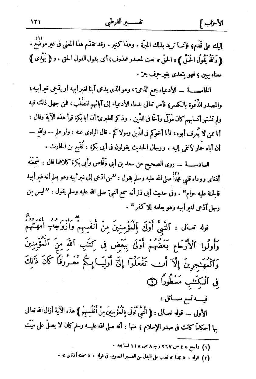 إِلَيْكَ عَلَى قَدَمٍ، فَإِنَّمَا تُرِيدُ بِذَلِكَ الْمَبَرَّةَ. وَهَذَا كَثِيرٌ. وَقَدْ تَقَدَّمَ هَذَا الْمَعْنَى فِي غَيْرِ مَوْضِعٍ «١». (وَاللَّهُ يَقُولُ الْحَقَّ) " الْحَقَّ" نَعْتٌ لمصدر محذوف، أي يقول القول الحق. و (يَهْدِي) مَعْنَاهُ يُبَيِّنُ، فَهُوَ يَتَعَدَّى بِغَيْرِ حَرْفِ جر. الخامسة- الْأَدْعِيَاءُ جَمْعُ الدَّعِيِّ وَهُوَ الَّذِي يُدْعَى ابْنًا لِغَيْرِ أَبِيهِ أَوْ يَدَّعِي غَيْرَ أَبِيهِ وَالْمَصْدَرُ الدِّعْوَةُ بِالْكَسْرِ فَأَمَرَ تَعَالَى بِدُعَاءِ الْأَدْعِيَاءِ إِلَى آبَائِهِمْ لِلصُّلْبِ فَمَنْ جُهِلَ ذَلِكَ فِيهِ وَلَمْ تَشْتَهِرْ أَنْسَابُهُمْ كَانَ مَوْلًى وَأَخًا فِي الدِّينِ. وذكر الطبري أن أبا بكر قَرَأَ هَذِهِ الْآيَةَ وَقَالَ: أَنَا مِمَّنْ لَا يُعْرَفُ أَبُوهُ فَأَنَا أَخُوكُمْ فِي الدِّينِ وَمَوْلَاكُمْ. قَالَ الرَّاوِي عَنْهُ: وَلَوْ عَلِمَ- وَاللَّهِ- أَنَّ أَبَاهُ حِمَارٌ لَانْتَمَى إِلَيْهِ. وَرِجَالُ الْحَدِيثِ يَقُولُونَ في أبي بكرة: نفيع بن الحارث. السادسة- روى الصَّحِيحِ عَنْ سَعْدِ بْنِ أَبِي وَقَّاصٍ وَأَبِي بكر كِلَاهُمَا قَالَ: سَمِعَتْهُ أُذُنَايَ وَوَعَاهُ قَلْبِي مُحَمَّدًا «٢» صَلَّى اللَّهُ عَلَيْهِ وَسَلَّمَ يَقُولُ: (مَنِ ادَّعَى إِلَى غَيْرِ أَبِيهِ وَهُوَ يَعْلَمُ أَنَّهُ غَيْرُ أَبِيهِ فَالْجَنَّةُ عَلَيْهِ حَرَامٌ). وَفِي حَدِيثِ أَبِي ذَرٍّ أَنَّهُ سَمِعَ النَّبِيَّ صَلَّى اللَّهُ عَلَيْهِ وَسَلَّمَ يَقُولُ: لَيْسَ مِنْ رَجُلٍ ادَّعَى لِغَيْرِ أبيه وهو يعلمه إلا كفر.