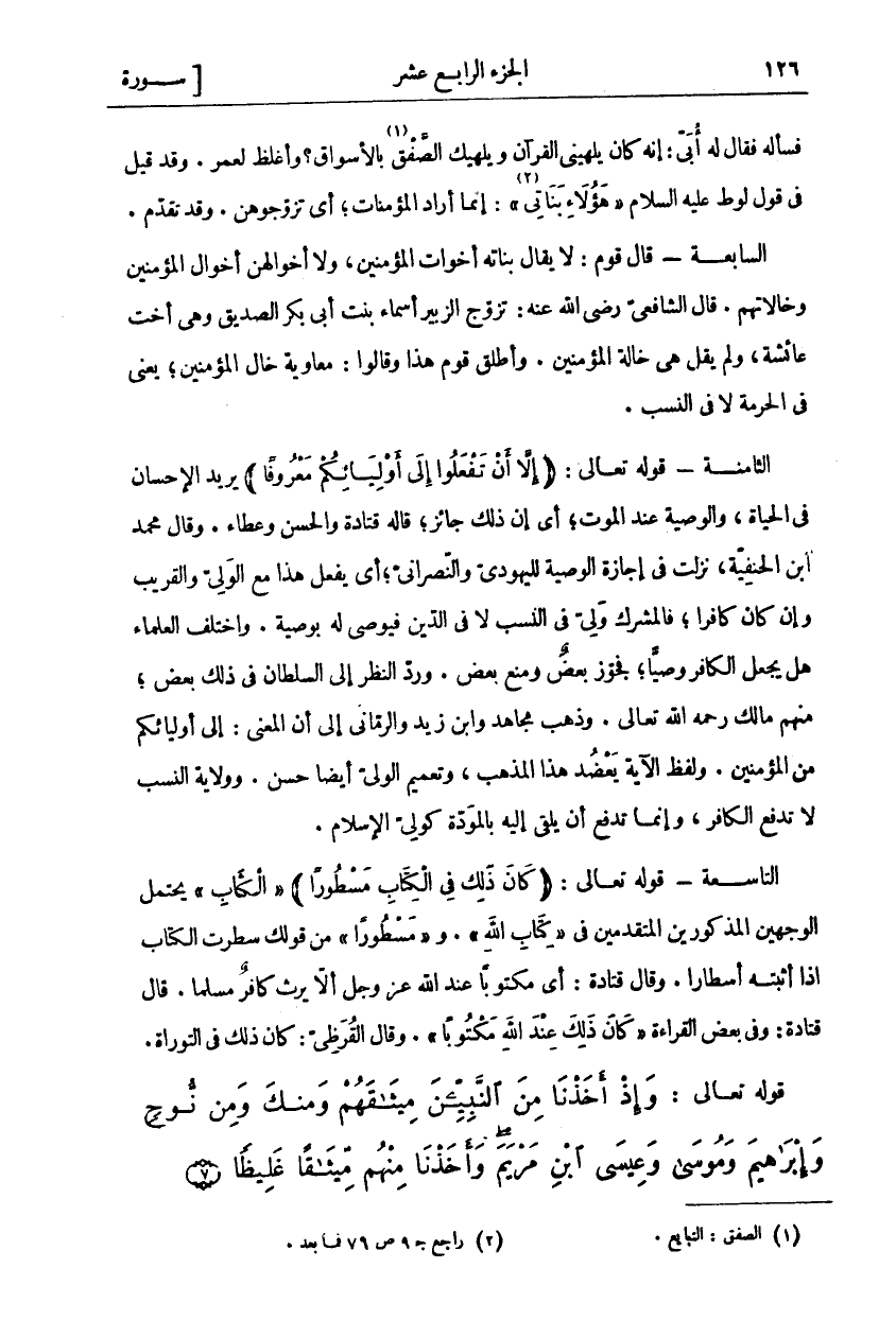 فَسَأَلَهُ فَقَالَ لَهُ أُبَيٌّ: إِنَّهُ كَانَ يُلْهِينِي الْقُرْآنُ وَيُلْهِيكَ الصَّفْقُ «١» بِالْأَسْوَاقِ؟ وَأَغْلَظَ لِعُمَرَ. وَقَدْ قِيلَ فِي قَوْلِ لُوطٍ عَلَيْهِ السَّلَامُ" هَؤُلَاءِ بناتي" «٢» [الحجر: ٧١]: إِنَّمَا أَرَادَ الْمُؤْمِنَاتِ، أَيْ تَزَوَّجُوهُنَّ. وَقَدْ تَقَدَّمَ. السَّابِعَةُ- قَالَ قَوْمٌ: لَا يُقَالُ بَنَاتُهُ أَخَوَاتُ الْمُؤْمِنِينَ، وَلَا أَخْوَالُهُنَّ أَخْوَالُ الْمُؤْمِنِينَ وَخَالَاتُهُمْ. قَالَ الشَّافِعِيُّ رَضِيَ اللَّهُ عَنْهُ: تَزَوَّجَ الزُّبَيْرُ أَسْمَاءَ بِنْتَ أَبِي بَكْرٍ الصِّدِّيقِ وَهِيَ أُخْتُ عَائِشَةَ، وَلَمْ يَقُلْ هِيَ خَالَةُ الْمُؤْمِنِينَ. وَأَطْلَقَ قَوْمٌ هَذَا وَقَالُوا: مُعَاوِيَةُ خَالُ الْمُؤْمِنِينَ، يَعْنِي فِي الْحُرْمَةِ لَا فِي النَّسَبِ. الثَّامِنَةُ- قَوْلُهُ تَعَالَى: (إِلَّا أَنْ تَفْعَلُوا إِلى أَوْلِيائِكُمْ مَعْرُوفاً) يُرِيدُ الْإِحْسَانَ فِي الْحَيَاةِ، وَالْوَصِيَّةَ عِنْدَ الْمَوْتِ، أَيْ أَنَّ ذَلِكَ جَائِزٌ، قَالَهُ قَتَادَةُ وَالْحَسَنُ وَعَطَاءٌ. وقال محمد ابن الْحَنَفِيَّةِ، نَزَلَتْ فِي إِجَازَةِ الْوَصِيَّةِ لِلْيَهُودِيِّ وَالنَّصْرَانِيِّ، أَيْ يَفْعَلُ هَذَا مَعَ الْوَلِيِّ وَالْقَرِيبِ وَإِنْ كَانَ كَافِرًا، فَالْمُشْرِكُ وَلِيٌّ فِي النَّسَبِ لَا فِي الدِّينِ فَيُوصَى لَهُ بِوَصِيَّةٍ. وَاخْتَلَفَ الْعُلَمَاءُ هَلْ يُجْعَلُ الْكَافِرُ وَصِيًّا، فَجَوَّزَ بَعْضٌ وَمَنَعَ بَعْضٌ. وَرَدَّ النَّظَرَ إِلَى السُّلْطَانِ فِي ذَلِكَ بَعْضٌ، مِنْهُمْ مَالِكٌ رَحِمَهُ اللَّهُ تَعَالَى. وَذَهَبَ مُجَاهِدٌ وَابْنُ زَيْدٍ وَالرُّمَّانِيُّ إِلَى أَنَّ الْمَعْنَى: إِلَى أَوْلِيَائِكُمْ مِنَ الْمُؤْمِنِينَ. وَلَفْظُ الْآيَةِ يُعْضِّدُ هَذَا الْمَذْهَبَ، وَتَعْمِيمُ الْوَلِيِّ أَيْضًا حَسَنٌ. وَوَلَايَةُ النَّسَبِ لَا تَدْفَعُ الْكَافِرَ، وَإِنَّمَا تَدْفَعُ أَنْ يُلْقَى إِلَيْهِ بِالْمَوَدَّةِ كَوَلِيِ الْإِسْلَامِ. التَّاسِعَةُ- قَوْلُهُ تَعَالَى: (كانَ ذلِكَ فِي الْكِتابِ مَسْطُوراً) " الْكِتَابِ" يَحْتَمِلُ الْوَجْهَيْنِ الْمَذْكُورَيْنِ الْمُتَقَدِّمَيْنِ فِي" كِتابِ اللَّهِ". وَ" مَسْطُوراً" مِنْ قَوْلِكَ سَطَرْتُ الْكِتَابَ إِذَا أَثْبَتُّهُ أَسْطَارًا. وَقَالَ قَتَادَةُ: أَيْ مَكْتُوبًا عِنْدَ اللَّهِ عَزَّ وَجَلَّ أَلَّا يَرِثَ كَافِرٌ مُسْلِمًا. قَالَ قَتَادَةُ: وَفِي بَعْضِ الْقِرَاءَةِ" كَانَ ذَلِكَ عِنْدَ اللَّهِ مَكْتُوبًا". وَقَالَ الْقُرَظِيُّ: كَانَ ذَلِكَ في التوراة.