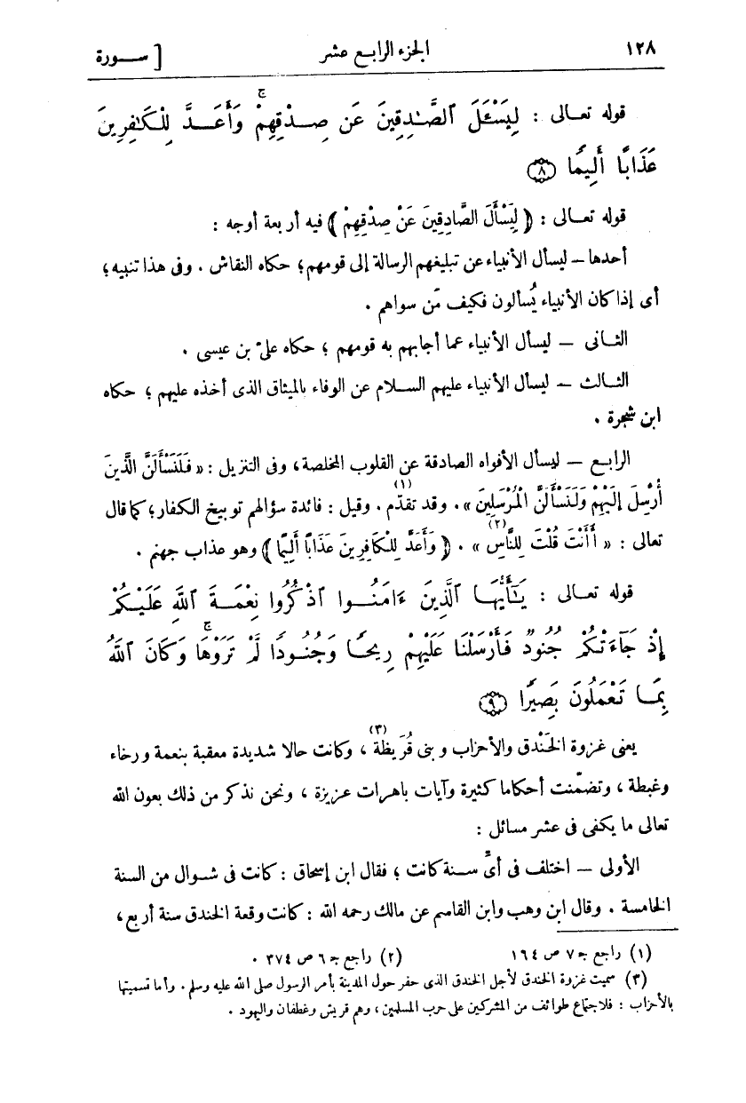 قوله تعالى: (لِيَسْئَلَ الصَّادِقِينَ عَنْ صِدْقِهِمْ) فِيهِ أَرْبَعَةُ أَوْجُهٍ: أَحَدُهَا- لِيَسْأَلَ الْأَنْبِيَاءَ عَنْ تَبْلِيغِهِمُ الرِّسَالَةَ إِلَى قَوْمِهِمْ، حَكَاهُ النَّقَّاشُ. وَفِي هَذَا تَنْبِيهٌ، أَيْ إِذَا كَانَ الْأَنْبِيَاءُ يُسْأَلُونَ فَكَيْفَ مَنْ سِوَاهُمْ. الثَّانِي- لِيَسْأَلَ الْأَنْبِيَاءَ عَمَّا أَجَابَهُمْ بِهِ قَوْمُهُمْ، حَكَاهُ عَلِيُّ بْنُ عِيسَى. الثَّالِثُ- لِيَسْأَلَ الْأَنْبِيَاءَ عَلَيْهِمُ السَّلَامُ عَنِ الْوَفَاءِ بِالْمِيثَاقِ الَّذِي أَخَذَهُ عَلَيْهِمْ، حَكَاهُ ابْنُ شَجَرَةَ. الرَّابِعُ- لِيَسْأَلَ الْأَفْوَاهَ الصَّادِقَةَ عن القلوب المخلصة، وفي التنزيل:" فَلَنَسْئَلَنَّ الَّذِينَ أُرْسِلَ إِلَيْهِمْ وَلَنَسْئَلَنَّ الْمُرْسَلِينَ" [الأعراف: ٦]. وَقَدْ تَقَدَّمَ «١». وَقِيلَ: فَائِدَةُ سُؤَالِهِمْ تَوْبِيخُ الْكُفَّارِ، كما قال تعالى:" أَأَنْتَ قُلْتَ لِلنَّاسِ" «٢» [المائدة: ١١٦]. (وَأَعَدَّ لِلْكافِرِينَ عَذاباً أَلِيماً) وَهُوَ عَذَابُ جَهَنَّمَ.