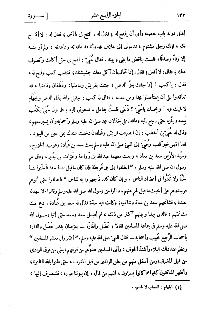 أَغْلَقَ دُونَهُ بَابَ حِصْنِهِ وَأَبَى أَنْ يَفْتَحَ لَهُ، فَقَالَ لَهُ: افْتَحْ لِي يَا أَخِي، فَقَالَ لَهُ: لَا أَفْتَحُ لَكَ، فَإِنَّكَ رَجُلٌ مَشْئُومٌ، تَدْعُونِي إِلَى خِلَافِ مُحَمَّدٍ وَأَنَا قَدْ عَاقَدْتُهُ وَعَاهَدْتُهُ، وَلَمْ أَرَ مِنْهُ إِلَّا وَفَاءً وَصِدْقًا، فَلَسْتُ بِنَاقِضٍ مَا بَيْنِي وَبَيْنَهُ. فَقَالَ حُيَيُّ: افْتَحْ لِي حَتَّى أُكَلِّمَكَ وَأَنْصَرِفَ عَنْكَ، فَقَالَ: لَا أَفْعَلُ، فَقَالَ: إِنَّمَا تَخَافُ أَنْ آكُلَ مَعَكَ جَشِيشَتَكَ، فَغَضِبَ كَعْبٌ وَفَتَحَ لَهُ، فَقَالَ: يَا كَعْبُ! إِنَّمَا جِئْتُكَ بِعِزِّ الدَّهْرِ، جِئْتُكَ بِقُرَيْشٍ وَسَادَتِهَا، وَغَطَفَانَ وَقَادَتِهَا، قَدْ تَعَاقَدُوا عَلَى أَنْ يَسْتَأْصِلُوا مُحَمَّدًا وَمَنْ مَعَهُ، فَقَالَ لَهُ كَعْبٌ: جِئْتَنِي وَاللَّهِ بِذُلِّ الدَّهْرِ وَبِجَهَامٍ «١» لَا غَيْثَ فِيهِ! وَيْحَكَ يَا حُيَيُّ؟ دَعْنِي فَلَسْتُ بِفَاعِلٍ مَا تَدْعُونِي إِلَيْهِ، فَلَمْ يَزَلْ حُيَيُّ بِكَعْبٍ يَعِدُهُ وَيَغُرُّهُ حَتَّى رَجَعَ إِلَيْهِ وَعَاقَدَهُ عَلَى خِذْلَانِ مُحَمَّدٍ صَلَّى اللَّهُ عَلَيْهِ وَسَلَّمَ وَأَصْحَابِهِ وَأَنْ يَسِيرَ مَعَهُمْ، وَقَالَ لَهُ حُيَيُّ بْنُ أَخْطَبَ: إِنِ انْصَرَفَتْ قُرَيْشٌ وَغَطَفَانُ دَخَلْتُ عِنْدَكَ بِمَنْ مَعِي مِنَ الْيَهُودِ. فَلَمَّا انْتَهَى خَبَرُ كَعْبٍ وَحُيَيٍّ إِلَى النَّبِيِّ صَلَّى اللَّهُ عَلَيْهِ وَسَلَّمَ بَعَثَ سَعْدَ بْنَ عُبَادَةَ وَهُوَ سَيِّدُ الْخَزْرَجِ، وَسَيِّدَ الْأَوْسِ سَعْدَ بْنَ مُعَاذٍ، وَبَعَثَ مَعَهُمَا عَبْدَ اللَّهِ بْنَ رَوَاحَةَ وَخَوَّاتَ بْنَ جُبَيْرٍ، وَقَالَ لَهُمْ رَسُولُ اللَّهِ صَلَّى اللَّهُ عَلَيْهِ وَسَلَّمَ: (انْطَلِقُوا إِلَى بَنِي قُرَيْظَةَ فَإِنْ كَانَ مَا قِيلَ لَنَا حَقًّا فَالْحَنُوا لَنَا لَحْنًا وَلَا تَفُتُّوا فِي أَعْضَادِ النَّاسِ. وَإِنْ كَانَ كَذِبًا فَاجْهَرُوا بِهِ لِلنَّاسِ) فَانْطَلَقُوا حَتَّى أَتَوْهُمْ فَوَجَدُوهُمْ عَلَى أَخْبَثِ مَا قِيلَ لَهُمْ عَنْهُمْ، وَنَالُوا مِنْ رَسُولِ اللَّهِ صَلَّى اللَّهُ عَلَيْهِ وَسَلَّمَ وَقَالُوا: لَا عَهْدَ لَهُ عِنْدَنَا، فَشَاتَمَهُمْ سَعْدُ بْنُ مُعَاذٍ وَشَاتَمُوهُ، وَكَانَتْ فِيهِ حِدَّةٌ فَقَالَ لَهُ سَعْدُ بْنُ عُبَادَةَ: دَعْ عَنْكَ مُشَاتَمَتَهُمْ، فَالَّذِي بَيْنَنَا وَبَيْنَهُمْ أَكْثَرُ مِنْ ذَلِكَ، ثُمَّ أَقْبَلَ سَعْدٌ وَسَعْدٌ حَتَّى أَتَيَا رَسُولَ اللَّهِ صَلَّى اللَّهُ عَلَيْهِ وَسَلَّمَ فِي جَمَاعَةِ الْمُسْلِمِينَ فَقَالَا: عَضَلٌ وَالْقَارَةُ- يُعَرِّضَانِ بِغَدْرِ عَضَلٍ وَالْقَارَةِ بِأَصْحَابِ الرَّجِيعِ خُبَيْبٍ وَأَصْحَابِهِ- فَقَالَ النَّبِيُّ صَلَّى اللَّهُ عَلَيْهِ وَسَلَّمَ. (أَبْشِرُوا يَا مَعْشَرَ الْمُسْلِمِينَ) وَعَظُمَ عِنْدَ ذَلِكَ الْبَلَاءُ وَاشْتَدَّ الْخَوْفُ، وَأَتَى الْمُسْلِمِينَ عَدُوُّهُمْ مِنْ فَوْقِهِمْ، يَعْنِي مِنْ فَوْقِ الْوَادِي مِنْ قِبَلِ الْمَشْرِقِ، وَمِنْ أَسْفَلَ مِنْهُمْ مِنْ بَطْنِ الْوَادِي من قبل المغرب، حتى ظنوا بالله الظنونا، وَأَظْهَرَ الْمُنَافِقُونَ كَثِيرًا مِمَّا كَانُوا يُسِرُّونَ، فَمِنْهُمْ مَنْ قَالَ: إِنَّ بُيُوتَنَا عَوْرَةٌ، فَلْنَنْصَرِفْ إِلَيْهَا،