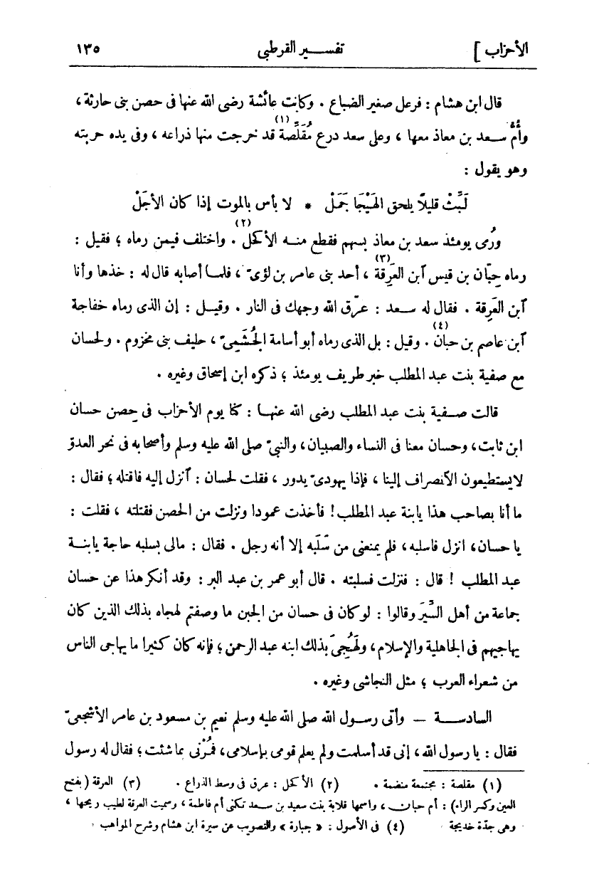 وَرُمِيَ يَوْمَئِذٍ سَعْدُ بْنُ مُعَاذٍ بِسَهْمٍ فَقَطَعَ مِنْهُ الْأَكْحَلَ «٢». وَاخْتُلِفَ فِيمَنْ رَمَاهُ، فَقِيلَ: رَمَاهُ حِبَّانُ بْنُ قَيْسٍ ابْنُ الْعَرِقَةِ «٣»، أَحَدُ بَنِي عَامِرِ بْنِ لُؤَيٍّ، فَلَمَّا أَصَابَهُ قَالَ لَهُ: خُذْهَا وَأَنَا ابْنُ الْعَرِقَةِ. فَقَالَ لَهُ سَعْدٌ: عَرَّقَ اللَّهُ وَجْهَكَ فِي النَّارِ. وقيل: إن الذي رماه خفاجة ابن عَاصِمِ بْنِ حِبَّانٍ «٤». وَقِيلَ: بَلِ الَّذِي رَمَاهُ أَبُو أُسَامَةَ الْجُشَمِيُّ، حَلِيفُ بَنِي مَخْزُومٍ. وَلِحَسَّانَ مَعَ صَفِيَّةَ بِنْتِ عَبْدِ الْمُطَّلِبِ خَبَرٌ طَرِيفٌ يَوْمَئِذٍ، ذَكَرَهُ ابْنُ إِسْحَاقَ وَغَيْرُهُ. قَالَتْ صَفِيَّةُ بِنْتُ عَبْدِ الْمُطَّلِبِ رَضِيَ اللَّهُ عَنْهَا: كُنَّا يوم الأحزاب في حصن حسان ابن ثَابِتٍ، وَحَسَّانُ مَعَنَا فِي النِّسَاءِ وَالصِّبْيَانِ، وَالنَّبِيُّ صَلَّى اللَّهُ عَلَيْهِ وَسَلَّمَ وَأَصْحَابُهُ فِي نَحْرِ الْعَدُوِّ لَا يَسْتَطِيعُونَ الِانْصِرَافَ إِلَيْنَا، فَإِذَا يَهُودِيٌّ يَدُورُ، فَقُلْتُ لِحَسَّانَ: انْزِلْ إِلَيْهِ فَاقْتُلْهُ، فَقَالَ: ما أنا بصاحب هذا يا بنة عَبْدِ الْمُطَّلِبِ! فَأَخَذْتُ عَمُودًا وَنَزَلْتُ مِنَ الْحِصْنِ فَقَتَلْتُهُ، فَقُلْتُ: يَا حَسَّانُ، انْزِلْ فَاسْلُبْهُ، فَلَمْ يَمْنَعْنِي مِنْ سَلَبِهُ إِلَّا أَنَّهُ رَجُلٌ. فَقَالَ: ما لي بسلبه حاجة يا بنة عبد المطلب! قال: فَنَزَلْتُ فَسَلَبْتُهُ. قَالَ أَبُو عُمَرَ بْنُ عَبْدِ الْبَرِّ: وَقَدْ أَنْكَرَ هَذَا عَنْ حَسَّانَ جَمَاعَةُ مِنْ أَهْلِ السِّيَرِ وَقَالُوا: لَوْ كَانَ فِي حَسَّانَ مِنَ الْجُبْنِ مَا وَصَفْتُمْ لَهَجَاهُ بِذَلِكَ الَّذِينَ كَانَ يُهَاجِيهِمْ فِي الْجَاهِلِيَّةِ وَالْإِسْلَامِ، وَلَهُجِيَ بِذَلِكَ ابْنُهُ عَبْدُ الرَّحْمَنِ، فَإِنَّهُ كَانَ كَثِيرًا مَا يُهَاجِي النَّاسَ مِنْ شُعَرَاءِ الْعَرَبِ، مِثْلَ النَّجَاشِيِّ وَغَيْرِهِ. السَّادِسَةُ- وَآتِي رَسُولَ اللَّهِ صَلَّى اللَّهُ عَلَيْهِ وَسَلَّمَ نُعَيْمُ بْنُ مَسْعُودِ بْنِ عَامِرٍ الْأَشْجَعِيُّ فَقَالَ: يَا رَسُولَ اللَّهِ، إِنِّي قَدْ أَسْلَمْتُ وَلَمْ يَعْلَمْ قَوْمِيِّ بِإِسْلَامِي، فَمُرْنِي بما شئت، فقال له رسول