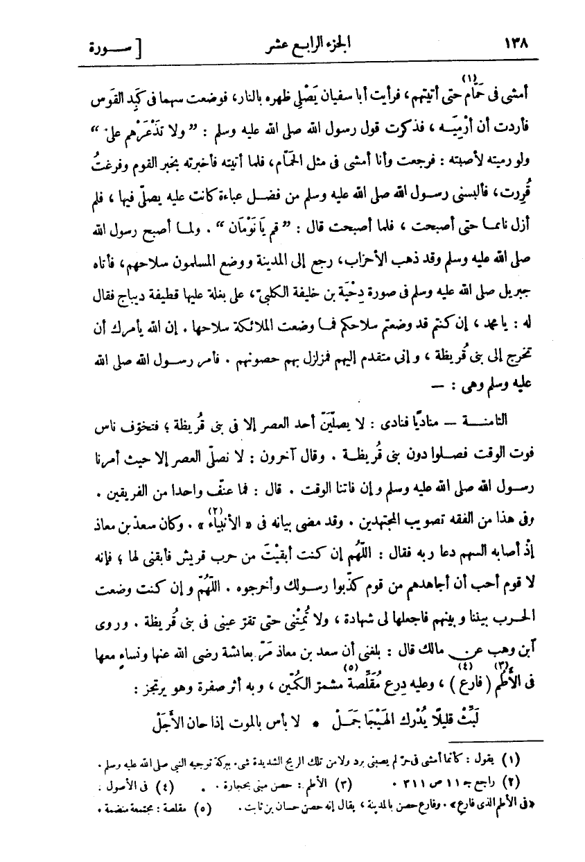أَمْشِي فِي حَمَّامٍ «١» حَتَّى أَتَيْتُهُمْ، فَرَأَيْتُ أَبَا سُفْيَانَ يَصْلِي ظَهْرَهُ بِالنَّارِ، فَوَضَعْتُ سَهْمًا فِي كَبِدِ الْقَوْسِ فَأَرَدْتُ أَنْ أَرْمِيَهُ، فَذَكَرْتُ قَوْلِ رَسُولِ اللَّهِ صَلَّى اللَّهُ عَلَيْهِ وَسَلَّمَ: (وَلَا تَذْعَرْهُمْ عَلَيَّ) وَلَوْ رَمَيْتُهُ لَأَصَبْتُهُ: فَرَجَعْتُ وَأَنَا أَمْشِي فِي مِثْلِ الْحَمَّامِ، فَلَمَّا أَتَيْتُهُ فَأَخْبَرْتُهُ بِخَبَرِ الْقَوْمِ وَفَرَغْتُ قُرِرْتُ، فَأَلْبَسَنِي رَسُولُ اللَّهِ صَلَّى اللَّهُ عَلَيْهِ وَسَلَّمَ مِنْ فَضْلِ عَبَاءَةٍ كَانَتْ عَلَيْهِ يُصَلِّي فِيهَا، فَلَمْ أَزَلْ نَائِمًا حَتَّى أَصْبَحْتُ، فَلَمَّا أَصْبَحْتُ قَالَ: (قُمْ يَا نَوْمَانُ). وَلَمَّا أَصْبَحَ رَسُولُ اللَّهِ صَلَّى اللَّهُ عَلَيْهِ وَسَلَّمَ وَقَدْ ذَهَبَ الْأَحْزَابُ، رَجَعَ إِلَى الْمَدِينَةِ وَوَضَعَ الْمُسْلِمُونَ سِلَاحَهُمْ، فَأَتَاهُ جِبْرِيلُ صَلَّى اللَّهُ عَلَيْهِ وَسَلَّمَ فِي صُورَةِ دِحْيَةَ بْنِ خَلِيفَةَ الْكَلْبِيِّ، عَلَى بَغْلَةٍ عَلَيْهَا قَطِيفَةُ دِيبَاجٍ فَقَالَ لَهُ: يَا مُحَمَّدُ، إِنْ كُنْتُمْ قَدْ وَضَعْتُمْ سِلَاحَكُمْ فَمَا وَضَعَتِ الْمَلَائِكَةُ سِلَاحَهَا. إِنَّ اللَّهَ يَأْمُرُكَ أَنْ تَخْرُجَ إِلَى بَنِي قُرَيْظَةَ، وَإِنِّي مُتَقَدِّمٌ إِلَيْهِمْ فَمُزَلْزِلٌ بِهِمْ حُصُونَهُمْ. فَأَمَرَ رَسُولُ اللَّهِ صَلَّى اللَّهُ عَلَيْهِ وَسَلَّمَ وَهِيَ:- الثَّامِنَةُ- مُنَادِيًا فَنَادَى: لَا يُصَلِّيَنَّ أَحَدٌ الْعَصْرَ إِلَّا فِي بَنِي قُرَيْظَةَ، فَتَخَوَّفَ نَاسٌ فَوْتَ الْوَقْتِ فَصَلُّوا دُونَ بَنِي قُرَيْظَةَ. وَقَالَ آخَرُونَ: لَا نُصَلِّي الْعَصْرَ إِلَّا حَيْثُ أَمَرَنَا رَسُولُ اللَّهِ صَلَّى اللَّهُ عَلَيْهِ وَسَلَّمَ وَإِنْ فَاتَنَا الْوَقْتُ. قَالَ: فَمَا عَنَّفَ وَاحِدًا مِنَ الْفَرِيقَيْنِ. وَفِي هَذَا مِنَ الْفِقْهِ تَصْوِيبُ الْمُجْتَهِدِينَ. وَقَدْ مَضَى بَيَانُهُ فِي" الْأَنْبِيَاءِ" «٢». وَكَانَ سَعْدُ بْنُ مُعَاذٍ إِذْ أَصَابَهُ السَّهْمُ دَعَا رَبَّهُ فَقَالَ: اللَّهُمَّ إِنْ كُنْتَ أَبْقَيْتَ مِنْ حَرْبِ قُرَيْشٍ فَأَبْقِنِي لَهَا، فَإِنَّهُ لَا قَوْمَ أَحَبُّ أَنْ أُجَاهِدَهُمْ مِنْ قَوْمٍ كَذَّبُوا رَسُولَكَ وَأَخْرَجُوهُ. اللَّهُمَّ وَإِنْ كُنْتَ وَضَعْتَ الْحَرْبَ بَيْنَنَا وَبَيْنَهُمْ فَاجْعَلْهَا لِي شَهَادَةً، وَلَا تُمِتْنِي حَتَّى تُقِرَّ عَيْنِي فِي بَنِي قُرَيْظَةَ. وَرَوَى ابْنُ وَهْبٍ عَنْ مَالِكٍ قَالَ: بَلَغَنِي أَنَّ سَعْدَ بْنَ مُعَاذٍ مَرَّ بِعَائِشَةَ رَضِيَ اللَّهُ عَنْهَا وَنِسَاءٍ مَعَهَا فِي الْأَطُمِ «٣» (فَارِعٍ) «٤»، وَعَلَيْهِ دِرْعٌ مُقَلِّصَةٌ «٥» مُشَمِّرٌ الْكُمَّيْنِ، وَبِهِ أَثَرُ صُفْرَةٍ وَهُوَ يَرْتَجِزُ:
