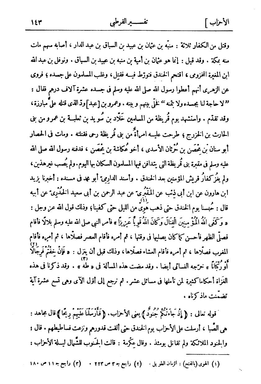 وَقُتِلَ مِنَ الْكُفَّارِ ثَلَاثَةٌ: مُنَبِّهُ بْنُ عُثْمَانَ بْنِ عُبَيْدِ بْنِ السَّبَّاقِ بْنِ عَبْدِ الدَّارِ، أَصَابَهُ سَهْمٌ مَاتَ مِنْهُ بِمَكَّةَ. وَقَدْ قِيلَ: إِنَّمَا هُوَ عُثْمَانُ بْنُ أُمَيَّةَ بْنِ مُنَبِّهِ بْنِ عُبَيْدِ بْنِ السَّبَّاقِ. وَنَوْفَلُ بْنُ عَبْدِ الله ابن الْمُغِيرَةِ الْمَخْزُومِيِّ، اقْتَحَمَ الْخَنْدَقَ فَتَوَرَّطَ فِيهِ فَقُتِلَ، وَغَلَبَ الْمُسْلِمُونَ عَلَى جَسَدِهِ، فَرُوِيَ عَنِ الزُّهْرِيِّ أَنَّهُمْ أَعْطَوْا رَسُولَ اللَّهِ صَلَّى اللَّهُ عَلَيْهِ وَسَلَّمَ فِي جَسَدِهِ عَشَرَةَ آلَافِ دِرْهَمٍ فَقَالَ: (لَا حَاجَةَ لَنَا بِجَسَدِهِ وَلَا بِثَمَنِهِ) فَخَلَّى بَيْنَهُمْ وَبَيْنَهُ. وَعَمْرُو بْنُ [عَبْدِ] وُدٍّ الَّذِي قَتَلَهُ عَلِيٌّ مُبَارَزَةً، وَقَدْ تَقَدَّمَ. وَاسْتُشْهِدَ يَوْمَ قُرَيْظَةَ مِنَ الْمُسْلِمِينَ خَلَّادُ بْنُ سُوَيْدِ بْنِ ثَعْلَبَةَ بْنِ عَمْرٍو مِنْ بَنِي الْحَارِثِ بْنِ الْخَزْرَجِ، طَرَحَتْ عَلَيْهِ امْرَأَةٌ مِنْ بَنِي قُرَيْظَةَ رَحًى فَقَتَلَتْهُ. وَمَاتَ فِي الْحِصَارِ أَبُو سِنَانِ بْنُ مِحْصَنِ بْنِ حُرْثَانَ الْأَسَدِيُّ، أَخُو عُكَّاشَةَ بْنِ مِحْصَنٍ، فَدَفَنَهُ رَسُولُ اللَّهِ صَلَّى اللَّهُ عَلَيْهِ وَسَلَّمَ فِي مَقْبَرَةِ بَنِي قُرَيْظَةَ الَّتِي يَتَدَافَنُ فِيهَا الْمُسْلِمُونَ السُّكَّانُ بِهَا الْيَوْمَ. وَلَمْ يُصَبْ غَيْرُ هَذَيْنِ، وَلَمْ يَغْزُ كُفَّارُ قُرَيْشٍ الْمُؤْمِنِينَ بَعْدَ الْخَنْدَقِ. وَأَسْنَدَ الدَّارِمِيُّ أَبُو مُحَمَّدٍ في مسنده: أخبرنا يزيد ابن هَارُونَ عَنِ ابْنِ أَبِي ذِئْبٍ عَنِ الْمَقْبُرِيِّ عَنْ عَبْدِ الرَّحْمَنِ بْنِ أَبِي سَعِيدٍ الْخُدْرِيِّ عَنْ أَبِيهِ قَالَ: حُبِسْنَا يَوْمَ الْخَنْدَقِ حَتَّى ذَهَبَ هَوِيٌّ «١» مِنَ اللَّيْلِ حَتَّى كُفِينَا، وَذَلِكَ قَوْلُ اللَّهِ عَزَّ وَجَلَّ:" وَكَفَى اللَّهُ الْمُؤْمِنِينَ الْقِتالَ وَكانَ اللَّهُ قَوِيًّا عَزِيزاً" [الأحزاب: ٢٥] فَأَمَرَ النَّبِيُّ صَلَّى اللَّهُ عَلَيْهِ وَسَلَّمَ بِلَالًا فَأَقَامَ فَصَلَّى الظُّهْرَ فَأَحْسَنَ كَمَا كَانَ يُصَلِّيهَا فِي وَقْتِهَا، ثُمَّ أَمَرَهُ فَأَقَامَ الْعَصْرَ فَصَلَّاهَا، ثُمَّ أَمَرَهُ فَأَقَامَ الْمَغْرِبَ فَصَلَّاهَا، ثُمَّ أَمَرَهُ فَأَقَامَ الْعِشَاءَ فَصَلَّاهَا، وَذَلِكَ قَبْلَ أَنْ يَنْزِلَ:" فَإِنْ خِفْتُمْ فَرِجالًا «٢» أَوْ رُكْباناً" [البقرة: ٢٣٩] خَرَّجَهُ النَّسَائِيُّ أَيْضًا. وَقَدْ مَضَتْ هَذِهِ الْمَسْأَلَةُ فِي" طَه" «٣». وَقَدْ ذَكَرْنَا فِي هَذِهِ الْغَزَاةِ أَحْكَامًا كَثِيرَةً لِمَنْ تَأَمَّلَهَا فِي مَسَائِلَ عَشْرٍ. ثُمَّ نَرْجِعُ إِلَى أَوَّلِ الْآيِ وَهِيَ تِسْعَ عَشْرَةَ آيَةً تَضَمَّنَتْ مَا ذَكَرْنَاهُ. قَوْلُهُ تَعَالَى: (إِذْ جاءَتْكُمْ جُنُودٌ) يَعْنِي الْأَحْزَابَ. (فَأَرْسَلْنا عَلَيْهِمْ رِيحاً) قَالَ مُجَاهِدٌ: هِيَ الصَّبَا، أُرْسِلَتْ عَلَى الْأَحْزَابِ يَوْمَ الْخَنْدَقِ حَتَّى أَلْقَتْ قُدُورَهُمْ وَنَزَعَتْ فَسَاطِيطَهُمْ. قَالَ: وَالْجُنُودُ الْمَلَائِكَةُ وَلَمْ تُقَاتِلْ يَوْمَئِذٍ. وَقَالَ عِكْرِمَةُ: قَالَتِ الْجَنُوبُ لِلشَّمَالِ لَيْلَةَ الْأَحْزَابِ: