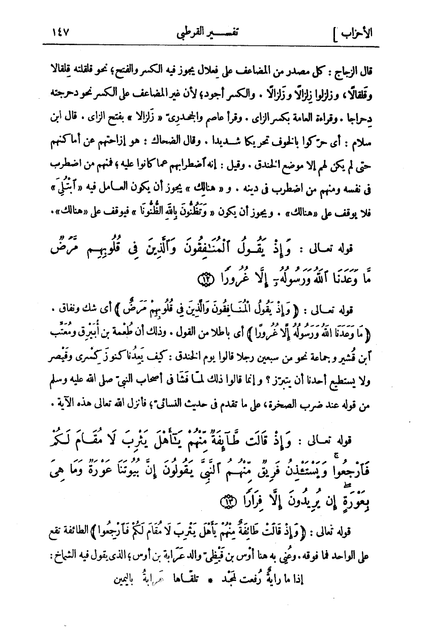 قَوْلُهُ تَعَالَى: (وَإِذْ يَقُولُ الْمُنافِقُونَ وَالَّذِينَ فِي قُلُوبِهِمْ مَرَضٌ) أَيْ شَكٌّ وَنِفَاقٌ. (مَا وَعَدَنَا اللَّهُ وَرَسُولُهُ إِلَّا غُرُوراً) أَيْ بَاطِلًا مِنَ الْقَوْلِ. وذلك أن طعمة بن أبيرق ومعتب ابن قشير وجماعة نحو مِنْ سَبْعِينَ رَجُلًا قَالُوا يَوْمَ الْخَنْدَقِ: كَيْفَ يَعِدُنَا كُنُوزَ كِسْرَى وَقَيْصَرَ وَلَا يَسْتَطِيعُ أَحَدُنَا أَنْ يَتَبَرَّزَ؟ وَإِنَّمَا قَالُوا ذَلِكَ لَمَّا فَشَا فِي أَصْحَابِ النَّبِيِّ صَلَّى اللَّهُ عَلَيْهِ وَسَلَّمَ مِنْ قَوْلِهِ عِنْدَ ضَرْبِ الصَّخْرَةِ، عَلَى مَا تَقَدَّمَ فِي حَدِيثِ النَّسَائِيِّ، فَأَنْزَلَ اللَّهُ تَعَالَى هذه الآية.