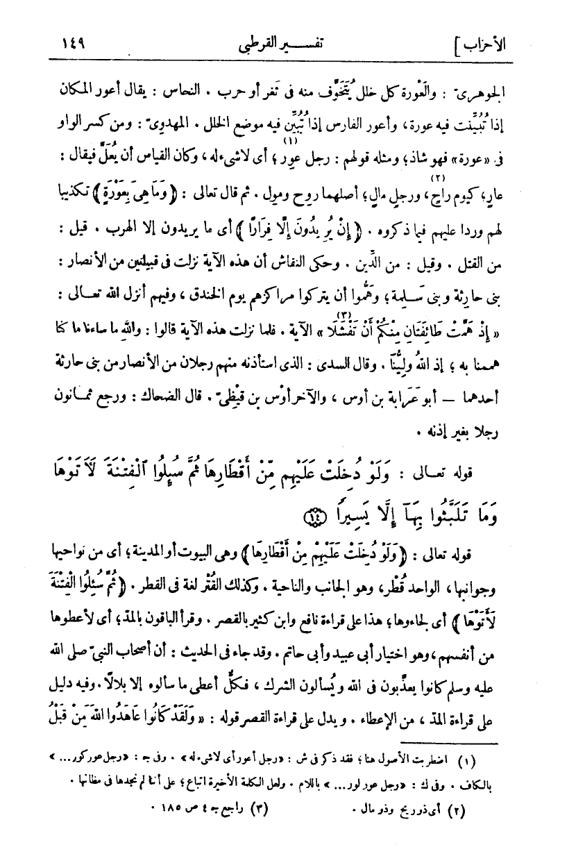 قَوْلُهُ تَعَالَى: (وَلَوْ دُخِلَتْ عَلَيْهِمْ مِنْ أَقْطارِها) وَهِيَ الْبُيُوتُ أَوِ الْمَدِينَةُ، أَيْ مِنْ نَوَاحِيهَا وَجَوَانِبِهَا، الْوَاحِدُ قُطْرٌ، وَهُوَ الْجَانِبُ وَالنَّاحِيَةُ. وَكَذَلِكَ الْقُتْرُ لُغَةٌ فِي الْقُطْرِ. (ثُمَّ سُئِلُوا الْفِتْنَةَ لَآتَوْها) أَيْ لَجَاءُوهَا، هَذَا عَلَى قِرَاءَةِ نَافِعٍ وَابْنِ كَثِيرٍ بِالْقَصْرِ. وَقَرَأَ الْبَاقُونَ بِالْمَدِّ، أَيْ لَأَعْطَوْهَا مِنْ أَنْفُسِهِمْ، وَهُوَ اخْتِيَارُ أَبِي عُبَيْدٍ وَأَبِي حَاتِمٍ. وَقَدْ جَاءَ فِي الْحَدِيثِ: أَنَّ أَصْحَابَ النَّبِيِّ صَلَّى اللَّهُ عَلَيْهِ وَسَلَّمَ كَانُوا يُعَذَّبُونَ فِي اللَّهِ وَيُسْأَلُونَ الشِّرْكَ، فَكُلٌّ أَعْطَى مَا سَأَلُوهُ إِلَّا بِلَالًا. وَفِيهِ دَلِيلٌ عَلَى قِرَاءَةِ الْمَدِّ، مِنَ الْإِعْطَاءِ. وَيَدُلُّ عَلَى قِرَاءَةِ الْقَصْرِ قَوْلُهُ:" وَلَقَدْ كانُوا عاهَدُوا اللَّهَ مِنْ قَبْلُ لا يُوَلُّونَ الْأَدْبارَ"