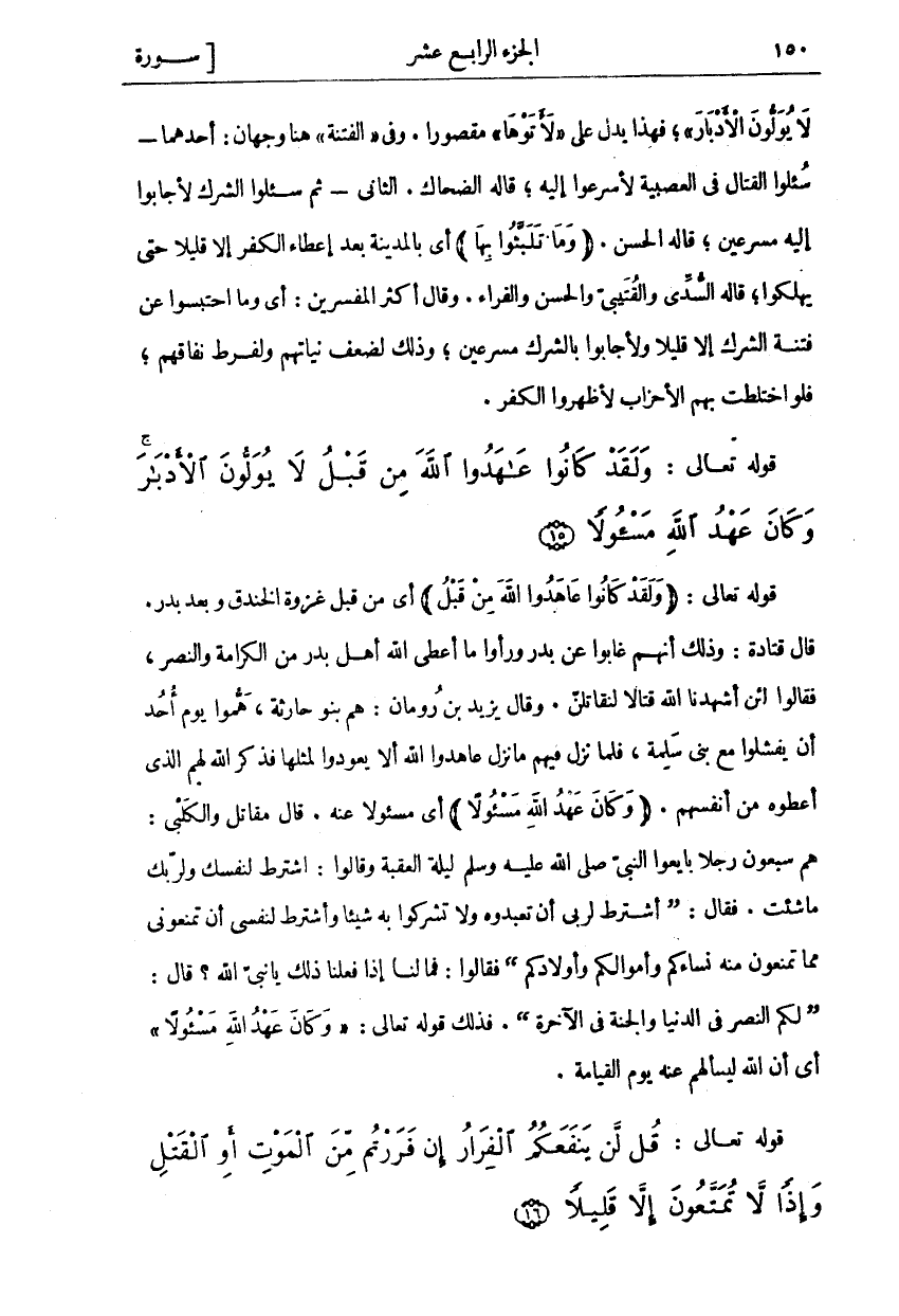 قَوْلُهُ تَعَالَى: (وَلَقَدْ كانُوا عاهَدُوا اللَّهَ مِنْ قَبْلُ) أَيْ مِنْ قَبْلِ غَزْوَةِ الْخَنْدَقِ وَبَعْدَ بَدْرٍ. قَالَ قَتَادَةُ: وَذَلِكَ أَنَّهُمْ غَابُوا عَنْ بَدْرٍ وَرَأَوْا مَا أَعْطَى اللَّهُ أَهْلَ بَدْرٍ مِنَ الْكَرَامَةِ وَالنَّصْرِ، فَقَالُوا لَئِنْ أَشْهَدَنَا اللَّهُ قِتَالًا لَنُقَاتِلَنَّ. وَقَالَ يَزِيدُ بْنُ رُومَانَ: هُمْ بَنُو حَارِثَةَ، هَمُّوا يَوْمَ أُحُدٍ أَنْ يَفْشَلُوا مَعَ بَنِي سَلَمَةَ، فَلَمَّا نَزَلَ فِيهِمْ مَا نَزَلَ عَاهَدُوا اللَّهَ أَلَّا يَعُودُوا لِمِثْلِهَا فَذَكَرَ اللَّهُ لَهُمُ الَّذِي أَعْطَوْهُ مِنْ أَنْفُسِهِمْ." وَكانَ عَهْدُ اللَّهِ مَسْؤُلًا" أَيْ مَسْئُولًا عَنْهُ. قَالَ مُقَاتِلٌ وَالْكَلْبِيُّ: هُمْ سَبْعُونَ رَجُلًا بَايَعُوا النَّبِيِّ صَلَّى اللَّهُ عَلَيْهِ وَسَلَّمَ لَيْلَةَ الْعَقَبَةِ وَقَالُوا: اشْتَرِطْ لِنَفْسِكَ وَلِرَبِّكَ مَا شِئْتَ. فَقَالَ: (أَشْتَرِطُ لِرَبِّي أَنْ تَعْبُدُوهُ وَلَا تُشْرِكُوا بِهِ شَيْئًا وَأَشْتَرِطُ لِنَفْسِيٍّ أَنْ تَمْنَعُونِي مِمَّا تَمْنَعُونَ مِنْهُ نِسَاءَكُمْ وَأَمْوَالَكُمْ وَأَوْلَادَكُمْ) فَقَالُوا: فَمَا لَنَا إِذَا فَعَلْنَا ذَلِكَ يَا نَبِيَّ اللَّهِ؟ قَالَ: (لَكُمُ النَّصْرُ فِي الدُّنْيَا وَالْجَنَّةُ فِي الْآخِرَةِ). فَذَلِكَ قَوْلُهُ تَعَالَى: (وَكانَ عَهْدُ اللَّهِ مَسْؤُلًا) أَيْ أَنَّ اللَّهَ لَيَسْأَلُهُمْ عَنْهُ يَوْمَ الْقِيَامَةِ.