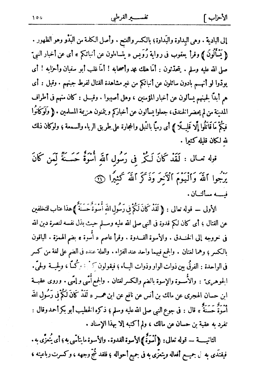فِيهِ مَسْأَلَتَانِ. الْأُولَى- قَوْلُهُ تَعَالَى (لَقَدْ كانَ لَكُمْ فِي رَسُولِ اللَّهِ أُسْوَةٌ حَسَنَةٌ) هَذَا عِتَابٌ لِلْمُتَخَلِّفِينَ عَنِ الْقِتَالِ، أَيْ كَانَ لَكُمْ قُدْوَةٌ فِي النَّبِيِّ صَلَّى اللَّهُ عَلَيْهِ وَسَلَّمَ حَيْثُ بَذَلَ نَفْسَهُ لِنُصْرَةِ دِينِ اللَّهِ فِي خُرُوجِهِ إِلَى الْخَنْدَقِ. وَالْأُسْوَةُ الْقُدْوَةُ. وَقَرَأَ عَاصِمٌ" أُسْوَةٌ" بِضَمِّ الْهَمْزَةِ. الْبَاقُونَ بِالْكَسْرِ، وَهُمَا لُغَتَانِ. وَالْجَمْعُ فِيهِمَا وَاحِدٌ عِنْدَ الْفَرَّاءِ. وَالْعِلَّةُ عِنْدَهُ فِي الضَّمِّ عَلَى لُغَةِ مَنْ كَسَرَ فِي الْوَاحِدَةِ: الْفَرْقُ بَيْنَ ذَوَاتِ الْوَاوِ وَذَوَاتِ الْيَاءِ، فَيَقُولُونَ كِسْوَةً وَكُسًا، وَلِحْيَةً وَلُحًى. الْجَوْهَرِيُّ: وَالْأُسْوَةُ وَالْإِسْوَةُ بِالضَّمِّ وَالْكَسْرِ لُغَتَانِ. وَالْجَمْعُ أُسًى وَإِسًى. وَرَوَى عقبة ابن حَسَّانٍ الْهَجَرِيُّ عَنْ مَالِكِ بْنِ أَنَسٍ عَنْ نَافِعٍ عَنِ ابْنِ عُمَرَ" لَقَدْ كانَ لَكُمْ فِي رَسُولِ اللَّهِ أُسْوَةٌ حَسَنَةٌ" قَالَ: فِي جُوعِ النَّبِيِّ صَلَّى اللَّهُ عَلَيْهِ وَسَلَّمَ، ذَكَرَهُ الْخَطِيبُ أَبُو بَكْرٍ أَحْمَدُ وَقَالَ: تَفَرَّدَ بِهِ عُقْبَةُ بْنُ حَسَّانٍ عَنْ مَالِكٍ، وَلَمْ أَكْتُبْهُ إِلَّا بِهَذَا الْإِسْنَادِ. الثَّانِيَةُ- قَوْلُهُ تَعَالَى" أُسْوَةٌ" الْأُسْوَةُ الْقُدْوَةُ. وَالْأُسْوَةُ مَا يُتَأَسَّى بِهِ، أَيْ يُتَعَزَّى بِهِ. فَيُقْتَدَى بِهِ فِي جَمِيعِ أَفْعَالِهِ وَيُتَعَزَّى بِهِ فِي جَمِيعِ أَحْوَالِهِ، فَلَقَدْ شُجَّ وَجْهُهُ، وَكُسِرَتْ رَبَاعِيَتُهُ،