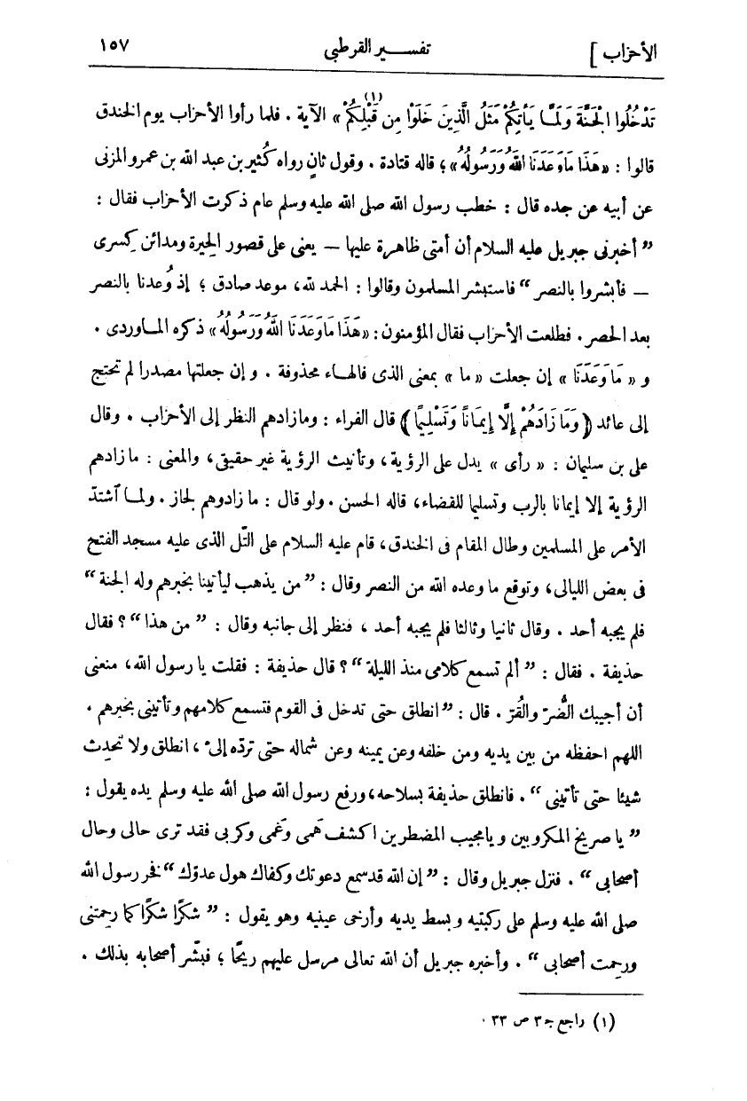 " أَمْ حَسِبْتُمْ أَنْ تَدْخُلُوا الْجَنَّةَ وَلَمَّا يَأْتِكُمْ مَثَلُ الَّذِينَ خَلَوْا مِنْ قَبْلِكُمْ" «١» [البقرة: ٢١٤] الآية. فلما رأوا الأحزاب يوم الخندق قالوا:" هَذَا مَا وَعَدَنَا اللَّهُ وَرَسُولُهُ"، قَالَهُ قَتَادَةُ. وَقَوْلٌ ثَانٍ رَوَاهُ كُثَيْرُ بْنُ عَبْدِ اللَّهِ بْنِ عَمْرٍو الْمُزَنِيُّ عَنْ أَبِيهِ عَنْ جَدِّهِ قَالَ: خَطَبَ رَسُولُ اللَّهِ صَلَّى اللَّهُ عَلَيْهِ وَسَلَّمَ عَامَ ذُكِرَتِ الْأَحْزَابُ فَقَالَ: (أَخْبَرَنِي جِبْرِيلُ عَلَيْهِ السَّلَامُ أَنَّ أُمَّتِي ظَاهِرَةٌ عَلَيْهَا- يَعْنِي عَلَى قُصُورِ الْحِيرَةِ وَمَدَائِنِ كِسْرَى- فَأَبْشِرُوا بِالنَّصْرِ) فَاسْتَبْشَرَ الْمُسْلِمُونَ وَقَالُوا: الْحَمْدُ لِلَّهِ، مَوْعِدُ صَادِقٍ، إِذْ وَعَدَنَا بِالنَّصْرِ بَعْدَ الْحَصْرِ. فَطَلَعَتِ الْأَحْزَابُ فقال المؤمنون:" هَذَا مَا وَعَدَنَا اللَّهُ وَرَسُولُهُ". ذَكَرَهُ الْمَاوَرْدِيُّ. وَ" مَا وَعَدَنَا" إِنْ جَعَلْتَ" مَا" بِمَعْنَى الَّذِي فَالْهَاءُ مَحْذُوفَةٌ. وَإِنْ جَعَلْتَهَا مَصْدَرًا لَمْ تَحْتَجْ إِلَى عَائِدٍ (وَما زادَهُمْ إِلَّا إِيماناً وَتَسْلِيماً) قَالَ الْفَرَّاءُ: وَمَا زَادَهُمُ النَّظَرُ إِلَى الأحزاب. وقال علي بن سليمان:" رَأَ" يَدُلُّ عَلَى الرُّؤْيَةِ، وَتَأْنِيثُ الرُّؤْيَةِ غَيْرُ حَقِيقِيٍّ، وَالْمَعْنَى: مَا زَادَهُمُ الرُّؤْيَةُ إِلَّا إِيمَانًا بِالرَّبِّ وتسليما للقضاء، قَالَهُ الْحَسَنُ. وَلَوْ قَالَ: مَا زَادُوهُمْ لَجَازَ. وَلَمَّا اشْتَدَّ الْأَمْرُ عَلَى الْمُسْلِمِينَ وَطَالَ الْمُقَامُ فِي الْخَنْدَقِ، قَامَ عَلَيْهِ السَّلَامُ عَلَى التَّلِّ الَّذِي عَلَيْهِ مَسْجِدُ الْفَتْحِ فِي بَعْضِ اللَّيَالِي، وَتَوَقَّعَ مَا وَعَدَهُ اللَّهُ مِنَ النَّصْرِ وَقَالَ: (مَنْ يَذْهَبُ لِيَأْتِيَنَا بِخَبَرِهِمْ وَلَهُ الْجَنَّةُ) فَلَمْ يُجِبْهُ أَحَدٌ. وَقَالَ ثَانِيًا وَثَالِثًا فَلَمْ يُجِبْهُ أَحَدٌ، فَنَظَرَ إِلَى جَانِبِهِ وَقَالَ: (مَنْ هَذَا)؟ فَقَالَ حُذَيْفَةُ. فَقَالَ: (أَلَمْ تَسْمَعْ كَلَامِي مُنْذُ اللَّيْلَةِ)؟ قَالَ حُذَيْفَةُ: فَقُلْتُ يَا رَسُولَ اللَّهِ، مَنَعَنِي أَنْ أُجِيبَكَ الضُّرُّ وَالْقُرُّ. قَالَ: (انْطَلِقْ حَتَّى تَدْخُلَ فِي الْقَوْمِ فَتَسْمَعَ كَلَامَهُمْ وَتَأْتِينِي بِخَبَرِهِمْ. اللَّهُمَّ احْفَظْهُ مِنْ بَيْنِ يَدَيْهِ وَمِنْ خَلْفِهِ وَعَنْ يَمِينِهِ وَعَنْ شِمَالِهِ حَتَّى تَرُدَّهُ إِلَيَّ، انْطَلِقْ وَلَا تُحْدِثْ شَيْئًا حَتَّى تَأْتِيَنِي (. فَانْطَلَقَ حُذَيْفَةُ بِسِلَاحِهِ، وَرَفَعَ رَسُولُ اللَّهِ صَلَّى اللَّهُ عَلَيْهِ وَسَلَّمَ يَدَهُ يَقُولُ:) يَا صَرِيخَ الْمَكْرُوبِينَ وَيَا مُجِيبَ الْمُضْطَرِّينَ اكْشِفْ هَمِّي وَغَمِّي وَكَرْبِي فَقَدْ تَرَى حَالِي وَحَالَ أَصْحَابِي) فَنَزَلَ جِبْرِيلُ وَقَالَ: (إِنَّ اللَّهَ قَدْ سَمِعَ دَعْوَتَكَ وَكَفَاكَ هَوْلَ عَدُوِّكَ) فَخَرَّ رَسُولُ اللَّهِ صَلَّى اللَّهُ عَلَيْهِ وَسَلَّمَ عَلَى رُكْبَتَيْهِ وَبَسَطَ يَدَيْهِ وَأَرْخَى عَيْنَيْهِ وَهُوَ يَقُولُ: (شُكْرًا شُكْرًا كَمَا رَحِمْتَنِي وَرَحِمْتَ أَصْحَابِي). وَأَخْبَرَهُ جِبْرِيلُ أَنَّ اللَّهَ تَعَالَى مُرْسِلٌ عَلَيْهِمْ رِيحًا، فَبَشَّرَ أَصْحَابَهُ بِذَلِكَ.