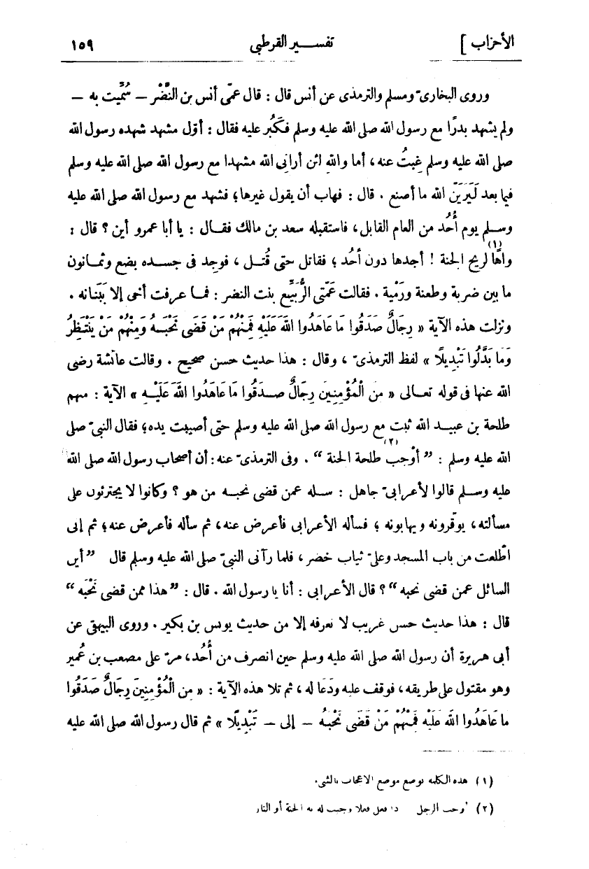 وَرَوَى الْبُخَارِيُّ وَمُسْلِمٌ وَالتِّرْمِذِيُّ عَنْ أَنَسٍ قَالَ: قَالَ عَمِّي أَنَسُ بْنُ النَّضْرِ- سُمِّيَتْ بِهِ- وَلَمْ يَشْهَدْ بَدْرًا مَعَ رَسُولِ اللَّهِ صَلَّى اللَّهُ عَلَيْهِ وَسَلَّمَ فَكَبُرَ عَلَيْهِ فَقَالَ: أَوَّلُ مَشْهَدٍ شَهِدَهُ رَسُولُ اللَّهِ صَلَّى اللَّهُ عَلَيْهِ وَسَلَّمَ غِبْتُ عَنْهُ، أَمَا وَاللَّهِ لَئِنْ أَرَانِي اللَّهُ مَشْهَدًا مَعَ رَسُولِ اللَّهِ صَلَّى اللَّهُ عَلَيْهِ وَسَلَّمَ فِيمَا بَعْدُ لَيَرَيَنَّ اللَّهُ مَا أَصْنَعُ. قَالَ: فَهَابَ أَنْ يَقُولَ غَيْرَهَا، فَشَهِدَ مَعَ رَسُولِ اللَّهِ صَلَّى اللَّهُ عَلَيْهِ وَسَلَّمَ يَوْمَ أُحُدٍ مِنَ الْعَامِ الْقَابِلِ، فَاسْتَقْبَلَهُ سَعْدُ بْنُ مَالِكٍ فَقَالَ: يَا أَبَا عَمْرٍو أَيْنَ؟ قَالَ: وَاهًا «١» لِرِيحِ الْجَنَّةِ! أَجِدُهَا دُونَ أُحُدٍ، فَقَاتَلَ حَتَّى قُتِلَ، فَوُجِدَ فِي جَسَدِهِ بِضْعٌ وَثَمَانُونَ مَا بَيْنَ ضَرْبَةٍ وَطَعْنَةٍ وَرَمْيَةٍ. فَقَالَتْ عَمَّتِي الرُّبَيِّعُ بِنْتُ النَّضْرِ: فَمَا عَرَفْتُ أَخِي إِلَّا بِبَنَانِهِ. وَنَزَلَتْ هَذِهِ الْآيَةُ" رِجالٌ صَدَقُوا مَا عاهَدُوا اللَّهَ عَلَيْهِ فَمِنْهُمْ مَنْ قَضى نَحْبَهُ وَمِنْهُمْ مَنْ يَنْتَظِرُ وَما بَدَّلُوا تَبْدِيلًا" لَفْظُ التِّرْمِذِيِّ، وَقَالَ: هَذَا حَدِيثٌ حَسَنٌ صَحِيحٌ. وَقَالَتْ عَائِشَةُ رَضِيَ اللَّهُ عَنْهَا فِي قَوْلِهِ تَعَالَى" مِنَ الْمُؤْمِنِينَ رِجالٌ صَدَقُوا مَا عاهَدُوا اللَّهَ عَلَيْهِ" الْآيَةَ: مِنْهُمْ طَلْحَةُ بْنُ عُبَيْدِ اللَّهِ ثَبَتَ مَعَ رَسُولِ اللَّهِ صَلَّى اللَّهُ عَلَيْهِ وَسَلَّمَ حَتَّى أُصِيبَتْ يَدُهُ، فَقَالَ النَّبِيُّ صَلَّى اللَّهُ عَلَيْهِ وَسَلَّمَ: (أَوْجَبَ «٢» طَلْحَةُ الْجَنَّةَ). وَفِي التِّرْمِذِيِّ عَنْهُ: أَنَّ أَصْحَابَ رَسُولِ اللَّهِ صَلَّى اللَّهُ عَلَيْهِ وَسَلَّمَ قَالُوا لِأَعْرَابِيٍّ جَاهِلٍ: سَلْهُ عَمَّنْ قَضَى نَحْبَهُ مَنْ هُوَ؟ وَكَانُوا لا يجترءون عَلَى مَسْأَلَتِهِ، يُوَقِّرُونَهُ وَيَهَابُونَهُ، فَسَأَلَهُ الْأَعْرَابِيُّ فَأَعْرَضَ عَنْهُ، ثُمَّ سَأَلَهُ فَأَعْرَضَ عَنْهُ، ثُمَّ إِنِّي اطَّلَعْتُ مِنْ بَابِ الْمَسْجِدِ وَعَلَيَّ ثِيَابٌ خُضْرٌ، فَلَمَّا رَآنِي النَّبِيُّ صَلَّى اللَّهُ عَلَيْهِ وَسَلَّمَ قَالَ: (أَيْنَ السَّائِلُ عَمَّنْ قَضَى نَحْبَهُ)؟ قَالَ الْأَعْرَابِيُّ: أَنَا يَا رَسُولَ اللَّهِ. قَالَ: (هَذَا مِمَّنْ قَضَى نَحْبَهُ) قَالَ: هَذَا حَدِيثٌ حَسَنٌ غَرِيبٌ لَا نَعْرِفُهُ إِلَّا مِنْ حَدِيثِ يُونُسَ بْنِ بُكَيْرٍ. وَرَوَى الْبَيْهَقِيُّ عَنْ أَبِي هُرَيْرَةَ أَنَّ رَسُولَ اللَّهِ صَلَّى اللَّهُ عَلَيْهِ وَسَلَّمَ حِينَ انْصَرَفَ مِنْ أُحُدٍ، مَرَّ عَلَى مُصْعَبِ بْنِ عُمَيْرٍ وَهُوَ مَقْتُولٌ عَلَى طَرِيقِهِ، فَوَقَفَ عَلَيْهِ وَدَعَا لَهُ، ثُمَّ تَلَا هَذِهِ الْآيَةَ:" مِنَ الْمُؤْمِنِينَ رِجالٌ صَدَقُوا مَا عاهَدُوا اللَّهَ عَلَيْهِ فَمِنْهُمْ مَنْ قَضى نَحْبَهُ"- إِلَى-" تَبْدِيلًا" ثُمَّ قَالَ رَسُولُ اللَّهِ صَلَّى اللَّهُ عَلَيْهِ