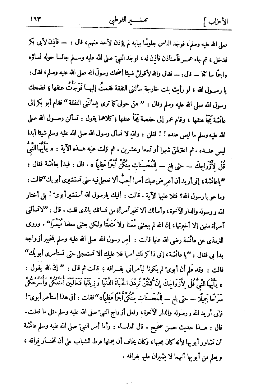 صَلَّى اللَّهُ عَلَيْهِ وَسَلَّمَ، فَوَجَدَ النَّاسَ جُلُوسًا بِبَابِهِ لَمْ يُؤْذَنْ لِأَحَدٍ مِنْهُمْ، قَالَ: فَأُذِنَ لِأَبِي بَكْرٍ فَدَخَلَ، ثُمَّ جَاءَ عُمَرُ فَاسْتَأْذَنَ فَأُذِنَ لَهُ، فَوَجَدَ النَّبِيَّ صَلَّى اللَّهُ عَلَيْهِ وَسَلَّمَ جَالِسًا حَوْلَهُ نِسَاؤُهُ وَاجِمًا سَاكِتًا. قَالَ:- فَقَالَ وَاللَّهِ لَأَقُولَنَّ شَيْئًا أُضْحِكُ رَسُولَ اللَّهِ صَلَّى اللَّهُ عَلَيْهِ وَسَلَّمَ، فَقَالَ: يَا رَسُولَ اللَّهِ، لَوْ رَأَيْتَ بِنْتَ خَارِجَةَ سَأَلَتْنِي النَّفَقَةَ فَقُمْتُ إِلَيْهَا فَوَجَأْتُ عُنُقَهَا، فَضَحِكَ رَسُولُ اللَّهِ صَلَّى اللَّهُ عَلَيْهِ وَسَلَّمَ وَقَالَ:" هُنَّ حَوْلِي كَمَا تَرَى يَسْأَلْنَنِي النَّفَقَةَ) فَقَامَ أَبُو بَكْرٍ إِلَى عَائِشَةَ يَجَأُ عُنُقَهَا، وَقَامَ عُمَرُ إِلَى حَفْصَةَ يَجَأُ عُنُقَهَا، كِلَاهُمَا يَقُولُ: تَسْأَلْنَ رَسُولَ اللَّهِ صَلَّى اللَّهُ عَلَيْهِ وَسَلَّمَ مَا لَيْسَ عِنْدَهُ!! فَقُلْنَ: وَاللَّهِ لَا نَسْأَلُ رَسُولِ اللَّهِ صَلَّى اللَّهُ عَلَيْهِ وَسَلَّمَ شَيْئًا أَبَدًا لَيْسَ عِنْدَهُ. ثُمَّ اعْتَزَلَهُنَّ شَهْرًا أَوْ تِسْعًا وَعِشْرِينَ. ثُمَّ نَزَلَتْ عَلَيْهِ هَذِهِ الْآيَةُ:" يَا أَيُّهَا النَّبِيُّ قُلْ لِأَزْواجِكَ"- حَتَّى بَلَغَ-" لِلْمُحْسِناتِ مِنْكُنَّ أَجْراً عَظِيماً". قَالَ: فَبَدَأَ بِعَائِشَةَ فَقَالَ: (يَا عَائِشَةُ، إِنِّي أُرِيدُ أَنْ أَعْرِضَ عَلَيْكِ أَمْرًا أُحِبُّ أَلَّا تَعْجَلِي فِيهِ حَتَّى تَسْتَشِيرِي أَبَوَيْكِ) قَالَتْ: وَمَا هُوَ يَا رَسُولَ اللَّهِ؟ فَتَلَا عَلَيْهَا الْآيَةَ. قَالَتْ: أَفِيكَ يَا رَسُولَ اللَّهِ أَسْتَشِيرُ أَبَوَيَّ! بَلْ أَخْتَارُ اللَّهَ وَرَسُولَهُ وَالدَّارَ الْآخِرَةَ، وَأَسْأَلُكَ أَلَّا تُخْبِرَ أَمْرَأَةً مِنْ نِسَائِكَ بِالَّذِي قُلْتُ. قَالَ: (لَا تَسْأَلُنِي امْرَأَةٌ مِنْهُنَّ إِلَّا أَخْبَرْتُهَا، إِنَّ اللَّهَ لَمْ يَبْعَثْنِي مُعَنِّتًا وَلَا مُتَعَنِّتًا وَلَكِنْ بَعَثَنِي مُعَلِّمًا مُيَسِّرًا (. وَرَوَى التِّرْمِذِيُّ عَنْ عَائِشَةَ رَضِيَ اللَّهُ عَنْهَا قَالَتْ: أَمَرَ رَسُولُ اللَّهِ صَلَّى اللَّهُ عَلَيْهِ وَسَلَّمَ بِتَخْيِيرِ أَزْوَاجِهِ بَدَأَ بِي فَقَالَ:) يَا عَائِشَةُ، إِنِّي ذَاكِرٌ لَكِ أَمْرًا فَلَا عَلَيْكِ أَلَّا تَسْتَعْجِلِي حَتَّى تَسْتَأْمِرِي أَبَوَيْكِ) قَالَتْ: وَقَدْ عَلِمَ أَنَّ أَبَوَيَّ لَمْ يَكُونَا لِيَأْمُرَانِي بِفِرَاقِهِ، قَالَتْ ثُمَّ قَالَ: (إِنَّ اللَّهَ يَقُولُ:" يَا أَيُّهَا النَّبِيُّ قُلْ لِأَزْواجِكَ إِنْ كُنْتُنَّ تُرِدْنَ الْحَياةَ الدُّنْيا وَزِينَتَها فَتَعالَيْنَ أُمَتِّعْكُنَّ وَأُسَرِّحْكُنَّ سَراحاً جَمِيلًا- حَتَّى بَلَغَ-" لِلْمُحْسِناتِ مِنْكُنَّ أَجْراً عَظِيماً" فَقُلْتُ: أَفِي هَذَا أَسْتَأْمِرُ أَبَوَيَّ! فَإِنِّي أُرِيدُ اللَّهَ وَرَسُولَهُ وَالدَّارَ الْآخِرَةَ، وَفَعَلَ أَزْوَاجُ النَّبِيِّ صَلَّى اللَّهُ عَلَيْهِ وَسَلَّمَ مثل مَا فَعَلَتْ. قَالَ: هَذَا حَدِيثٌ حَسَنٌ صَحِيحٌ. قَالَ الْعُلَمَاءَ: وَأَمَّا أَمْرُ النَّبِيِّ صَلَّى اللَّهُ عَلَيْهِ وَسَلَّمَ عَائِشَةَ أَنْ تُشَاوِرَ أَبَوَيْهَا لِأَنَّهُ كَانَ يُحِبُّهَا، وَكَانَ يَخَافُ أَنْ يَحْمِلَهَا فَرْطُ الشَّبَابِ عَلَى أَنْ تَخْتَارَ فِرَاقَهُ، وَيَعْلَمَ مِنْ أَبَوَيْهَا أَنَّهُمَا لَا يُشِيرَانِ عَلَيْهَا بِفِرَاقِهِ.