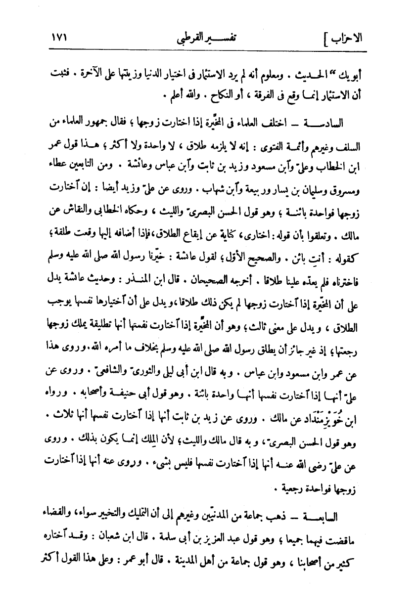 أَبَوَيْكِ) الْحَدِيثَ. وَمَعْلُومٌ أَنَّهُ لَمْ يُرِدِ الِاسْتِئْمَارَ فِي اخْتِيَارِ الدُّنْيَا وَزِينَتِهَا عَلَى الْآخِرَةِ. فَثَبَتَ أَنَّ الِاسْتِئْمَارَ إِنَّمَا وَقَعَ فِي الْفُرْقَةِ، أَوِ النكاح. والله أعلم. السادسة- اختلف الْعُلَمَاءُ فِي الْمُخَيَّرَةِ إِذَا اخْتَارَتْ زَوْجَهَا، فَقَالَ جُمْهُورُ الْعُلَمَاءِ مِنَ السَّلَفِ وَغَيْرِهِمْ وَأَئِمَّةُ الْفَتْوَى: إِنَّهُ لَا يَلْزَمُهُ طَلَاقٌ، لَا وَاحِدَةَ وَلَا أَكْثَرَ، هَذَا قَوْلُ عُمَرَ بْنِ الْخَطَّابِ وَعَلِيٍّ وَابْنِ مَسْعُودٍ وَزَيْدِ بْنِ ثَابِتٍ وَابْنِ عَبَّاسٍ وَعَائِشَةَ. وَمِنَ التَّابِعِينَ عَطَاءٌ وَمَسْرُوقٌ وَسُلَيْمَانُ بْنُ يَسَارٍ وَرَبِيعَةُ وَابْنُ شِهَابٍ. وَرُوِيَ عَنْ عَلِيٍّ وَزَيْدٍ أَيْضًا: إِنِ اخْتَارَتْ زَوْجَهَا فَوَاحِدَةٌ بَائِنَةٌ، وَهُوَ قَوْلُ الْحَسَنِ الْبَصْرِيِّ وَاللَّيْثِ، وَحَكَاهُ الْخَطَّابِيُّ وَالنَّقَّاشُ عَنْ مَالِكٍ. وَتَعَلَّقُوا بِأَنَّ قَوْلَهُ: اخْتَارِي، كِنَايَةٌ عَنْ إِيقَاعِ الطَّلَاقِ، فَإِذَا أَضَافَهُ إِلَيْهَا وَقَعَتْ طَلْقَةً، كَقَوْلِهِ: أَنْتِ بَائِنٌ. وَالصَّحِيحُ الْأَوَّلُ، لِقَوْلِ عَائِشَةَ: خَيَّرَنَا رَسُولُ اللَّهِ صَلَّى اللَّهُ عَلَيْهِ وَسَلَّمَ فَاخْتَرْنَاهُ فَلَمْ يَعُدُّهُ عَلَيْنَا طَلَاقًا. أَخْرَجَهُ الصَّحِيحَانِ. قَالَ ابْنُ الْمُنْذِرِ: وَحَدِيثُ عَائِشَةَ يدل عَلَى أَنَّ الْمُخَيَّرَةَ إِذَا اخْتَارَتْ زَوْجَهَا لَمْ يَكُنْ ذَلِكَ طَلَاقًا، وَيَدُلُّ عَلَى أَنَّ اخْتِيَارَهَا نَفْسَهَا يُوجِبُ الطَّلَاقَ، وَيَدُلُّ عَلَى مَعْنًى ثَالِثٍ، وَهُوَ أَنَّ الْمُخَيَّرَةَ إِذَا اخْتَارَتْ نَفْسَهَا أَنَّهَا تَطْلِيقَةٌ يَمْلِكُ زَوْجُهَا رَجْعَتَهَا، إِذْ غَيْرُ جَائِزٍ أَنْ يُطَلِّقَ رَسُولُ اللَّهِ صَلَّى اللَّهُ عَلَيْهِ وَسَلَّمَ بِخِلَافِ مَا أَمَرَهُ اللَّهُ. وَرُوِيَ هَذَا عَنْ عُمَرَ وَابْنِ مَسْعُودٍ وَابْنِ عَبَّاسٍ. وَبِهِ قَالَ ابْنُ أَبِي لَيْلَى وَالثَّوْرِيُّ وَالشَّافِعِيُّ. وَرُوِيَ عَنْ عَلِيٍّ أَنَّهَا إِذَا اخْتَارَتْ نَفْسَهَا أَنَّهَا وَاحِدَةٌ بَائِنَةٌ. وَهُوَ قَوْلُ أَبِي حَنِيفَةَ وَأَصْحَابِهِ. وَرَوَاهُ ابْنُ خُوَيْزِ مَنْدَادَ عَنْ مَالِكٍ. وَرُوِيَ عَنْ زَيْدِ: بْنِ ثَابِتٍ أَنَّهَا إِذَا اخْتَارَتْ نَفْسهَا أَنَّهَا ثَلَاثٌ. وَهُوَ قَوْلُ الْحَسَنِ الْبَصْرِيِّ، وَبِهِ قَالَ مَالِكٌ وَاللَّيْثُ، لِأَنَّ الْمِلْكَ إِنَّمَا يَكُونُ بِذَلِكَ. وَرُوِيَ عَنْ عَلِيٍّ رَضِيَ اللَّهُ عَنْهُ أَنَّهَا إِذَا اخْتَارَتْ نَفْسَهَا فَلَيْسَ بِشَيْءٍ. وَرُوِيَ عَنْهُ أَنَّهَا إِذَا اخْتَارَتْ زَوْجَهَا فَوَاحِدَةٌ رَجْعِيَّةٌ. السَّابِعَةُ- ذَهَبَ جَمَاعَةٌ مِنَ الْمَدَنِيِّينَ وَغَيْرِهِمْ إِلَى أَنَّ التَّمْلِيكَ وَالتَّخْيِيرَ سَوَاءٌ، وَالْقَضَاءَ مَا قَضَتْ فِيهِمَا جَمِيعًا، وَهُوَ قَوْلُ عَبْدِ الْعَزِيزِ بْنِ أَبِي سَلَمَةَ. قَالَ ابْنُ شَعْبَانَ: وَقَدِ اخْتَارَهُ كَثِيرٌ مِنْ أَصْحَابِنَا، وَهُوَ قَوْلُ جَمَاعَةٍ مِنْ أَهْلِ الْمَدِينَةِ. قَالَ أَبُو عُمَرَ: وَعَلَى هَذَا الْقَوْلِ أَكْثَرُ