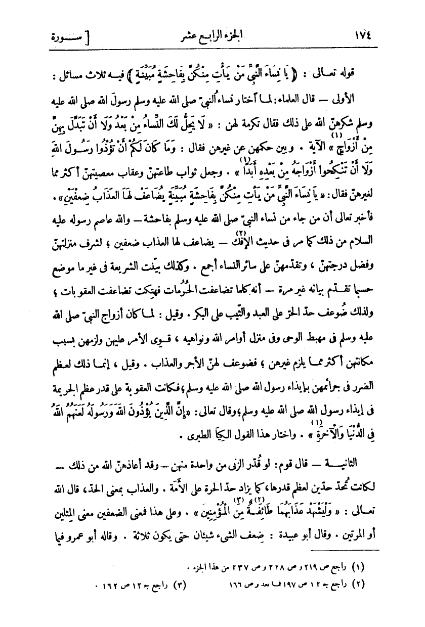 قَوْلُهُ تَعَالَى: (يَا نِساءَ النَّبِيِّ مَنْ يَأْتِ مِنْكُنَّ بِفاحِشَةٍ مُبَيِّنَةٍ) فِيهِ ثَلَاثُ مَسَائِلَ: الْأُولَى: قَالَ الْعُلَمَاءُ: لَمَّا اخْتَارَ نِسَاءُ النَّبِيِّ صَلَّى اللَّهُ عَلَيْهِ وَسَلَّمَ رَسُولَ اللَّهِ صَلَّى اللَّهُ عَلَيْهِ وَسَلَّمَ شَكَرَهُنَّ اللَّهُ عَلَى ذَلِكَ فَقَالَ تَكْرِمَةً لَهُنَّ:" لَا يَحِلُّ لَكَ النِّساءُ مِنْ بَعْدُ وَلا أَنْ تَبَدَّلَ بِهِنَّ مِنْ أَزْواجٍ" «١» [الأحزاب: ٥٢] الْآيَةَ. وَبَيَّنَ حُكْمَهُنَّ عَنْ غَيْرِهِنَّ فَقَالَ:" وَما كانَ لَكُمْ أَنْ تُؤْذُوا رَسُولَ اللَّهِ وَلا أَنْ تَنْكِحُوا أَزْواجَهُ مِنْ بَعْدِهِ أَبَداً" «٢» [الأحزاب: ٥٣]. وَجَعَلَ ثَوَابَ طَاعَتِهِنَّ وَعِقَابَ مَعْصِيَتِهِنَّ أَكْثَرَ مِمَّا لِغَيْرِهِنَّ فَقَالَ:" يَا نِساءَ النَّبِيِّ مَنْ يَأْتِ مِنْكُنَّ بِفاحِشَةٍ مُبَيِّنَةٍ يُضاعَفْ لَهَا الْعَذابُ ضِعْفَيْنِ" فَأَخْبَرَ تَعَالَى أَنَّ مَنْ جَاءَ مِنْ نِسَاءِ النَّبِيِّ صَلَّى اللَّهُ عَلَيْهِ وَسَلَّمَ بِفَاحِشَةٍ- وَاللَّهُ عَاصِمٌ رَسُولَهُ عَلَيْهِ السَّلَامُ مِنْ ذَلِكَ كَمَا مَرَّ فِي حَدِيثِ الْإِفْكِ «٣» - يُضَاعَفْ لَهَا الْعَذَابُ ضِعْفَيْنِ، لِشَرَفِ مَنْزِلَتِهِنَّ وَفَضْلِ دَرَجَتِهِنَّ، وَتَقَدُّمِهِنَّ عَلَى سَائِرِ النِّسَاءِ أَجْمَعَ. وَكَذَلِكَ بَيَّنَتِ الشَّرِيعَةُ فِي غَيْرِ مَا مَوْضِعٍ حَسْبَمَا تَقَدَّمَ بَيَانُهُ غَيْرَ مَرَّةٍ- أَنَّهُ كُلَّمَا تَضَاعَفَتِ الْحُرُمَاتُ فَهُتِكَتْ تَضَاعَفَتِ الْعُقُوبَاتُ، وَلِذَلِكَ ضُوعِفَ حَدُّ الْحُرِّ عَلَى الْعَبْدِ والثيب على البكر. وقيل: لما كان أزوج النَّبِيِّ صَلَّى اللَّهُ عَلَيْهِ وَسَلَّمَ فِي مَهْبِطِ الْوَحْيِ وَفِي مَنْزِلِ أَوَامِرِ اللَّهِ وَنَوَاهِيهِ، قَوِيَ الْأَمْرُ عَلَيْهِنَّ وَلَزِمَهُنَّ بِسَبَبِ مَكَانَتِهِنَّ أَكْثَرَ مِمَّا يَلْزَمُ غَيْرَهُنَّ، فَضُوعِفَ لَهُنَّ الْأَجْرُ وَالْعَذَابُ. وَقِيلَ، إِنَّمَا ذَلِكَ لِعِظَمِ الضَّرَرِ فِي جَرَائِمِهِنَّ بِإِيذَاءِ رَسُولِ اللَّهِ صَلَّى اللَّهُ عَلَيْهِ وَسَلَّمَ، فَكَانَتِ الْعُقُوبَةُ عَلَى قَدْرِ عِظَمِ الْجَرِيمَةِ فِي إِيذَاءِ رَسُولِ اللَّهِ صَلَّى اللَّهُ عَلَيْهِ وَسَلَّمَ، وَقَالَ تَعَالَى:" إِنَّ الَّذِينَ يُؤْذُونَ اللَّهَ وَرَسُولَهُ لَعَنَهُمُ اللَّهُ فِي الدُّنْيا وَالْآخِرَةِ" «٤» [الأحزاب: ٥٧]. وَاخْتَارَ هَذَا الْقَوْلَ إِلْكِيَا الطَّبَرِيُّ. الثَّانِيَةُ- قَالَ قَوْمٌ: لَوْ قُدِّرَ الزِّنَى مِنْ وَاحِدَةٍ مِنْهُنَّ- وَقَدْ أَعَاذَهُنَّ اللَّهُ مِنْ ذَلِكَ- لَكَانَتْ تُحَدُّ حَدَّيْنِ لِعِظَمِ قَدْرِهَا، كَمَا يُزَادُ حَدُّ الْحُرَّةِ عَلَى الْأَمَةِ. وَالْعَذَابُ بِمَعْنَى الْحَدِّ، قَالَ اللَّهُ تعالى:" وَلْيَشْهَدْ عَذابَهُما طائِفَةٌ «٥» مِنَ «٦» الْمُؤْمِنِينَ" [النور: ٢]. وَعَلَى هَذَا فَمَعْنَى الضِّعْفَيْنِ مَعْنَى الْمِثْلَيْنِ أَوِ الْمَرَّتَيْنِ،. وَقَالَ أَبُو عُبَيْدَةَ: ضِعْفُ الشَّيْءِ شَيْئَانِ حَتَّى يَكُونَ ثَلَاثَةً. وَقَالَهُ أَبُو عَمْرٍو فِيمَا