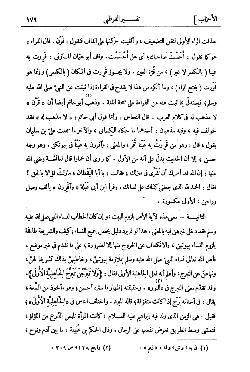 حُذِفَتِ الرَّاءُ الْأُولَى لِثِقَلِ التَّضْعِيفِ، وَأُلْقِيَتْ حَرَكَتُهَا عَلَى الْقَافِ فَتَقُولُ: قَرْنَ. قَالَ الْفَرَّاءُ: هُوَ كنا تَقُولُ: أَحَسْتَ صَاحِبكَ، أَيْ هَلْ أَحْسَسْتَ. وَقَالَ أَبُو عُثْمَانَ الْمَازِنِيُّ: قَرِرْتُ بِهِ عَيْنًا (بِالْكَسْرِ لَا غَيْرَ)، مِنْ قُرَّةِ الْعَيْنِ. وَلَا يَجُوزُ قَرِرْتُ فِي الْمَكَانِ (بِالْكَسْرِ) وَإِنَّمَا هُوَ قَرَرْتُ (بِفَتْحِ الرَّاءِ)، وَمَا أَنْكَرَهُ مِنْ هَذَا لَا يَقْدَحُ فِي الْقِرَاءَةِ إِذَا ثَبَتَتْ عَنِ النَّبِيِّ صَلَّى اللَّهُ عَلَيْهِ وَسَلَّمَ، فَيُسْتَدَلُّ بِمَا ثَبَتَ عَنْهُ مِنَ الْقِرَاءَةِ عَلَى صِحَّةِ اللُّغَةِ. وَذَهَبَ «١» أَبُو حَاتِمٍ أَيْضًا أَنَّ" قَرْنَ" لَا مَذْهَبَ لَهُ فِي كَلَامِ الْعَرَبِ. قَالَ النَّحَّاسُ: وَأَمَّا قَوْلُ أَبِي حَاتِمٍ:" لَا مَذْهَبَ لَهُ" فَقَدْ خُولِفَ فِيهِ، وَفِيهِ مَذْهَبَانِ: أَحَدُهُمَا مَا حَكَاهُ الْكِسَائِيُّ، وَالْآخَرُ مَا سَمِعْتُ عَلِيَّ بْنَ سُلَيْمَانَ يَقُولُ، قَالَ: وَهُوَ مِنْ قَرِرْتُ بِهِ عَيْنًا أَقَرُّ، وَالْمَعْنَى: وَاقْرَرْنَ بِهِ عَيْنًا فِي بُيُوتِكُنَّ. وَهُوَ وَجْهٌ حَسَنٌ، إِلَّا أَنَّ الْحَدِيثَ يَدُلُّ عَلَى أَنَّهُ مِنَ الْأَوَّلِ. كَمَا رُوِيَ أَنَّ عَمَّارًا قَالَ لِعَائِشَةَ رَضِيَ اللَّهُ عَنْهَا: إِنَّ اللَّهَ قَدْ أَمَرَكِ أَنْ تَقَرِّي فِي مَنْزِلِكِ، فَقَالَتْ: يَا أَبَا الْيَقْظَانِ، مَا زِلْتَ قَوَّالًا بِالْحَقِّ! فَقَالَ: الْحَمْدُ لِلَّهِ الَّذِي جَعَلَنِي كَذَلِكَ عَلَى لِسَانِكِ. وَقَرَأَ ابْنُ أَبِي عَبْلَةَ" وَاقْرِرْنَ" بِأَلِفِ وَصْلٍ وَرَاءَيْنِ، الْأُولَى مَكْسُورَةٌ. الثَّانِيَةُ- مَعْنَى هَذِهِ الْآيَةِ الْأَمْرُ بِلُزُومِ الْبَيْتِ، وَإِنْ كَانَ الْخِطَابُ لِنِسَاءِ النَّبِيِّ صَلَّى اللَّهُ عَلَيْهِ وَسَلَّمَ فَقَدْ دَخَلَ غَيْرُهُنَّ فِيهِ بِالْمَعْنَى. هَذَا لَوْ لَمْ يَرِدْ دَلِيلٌ يَخُصُّ جَمِيعَ النِّسَاءِ، كَيْفَ وَالشَّرِيعَةُ طَافِحَةٌ بِلُزُومِ النِّسَاءِ بُيُوتَهَنَّ، وَالِانْكِفَافِ عَنِ الْخُرُوجِ مِنْهَا إِلَّا لِضَرُورَةٍ، عَلَى مَا تَقَدَّمَ فِي غَيْرِ مَوْضِعٍ. فَأَمَرَ اللَّهُ تَعَالَى نِسَاءَ النَّبِيِّ صَلَّى اللَّهُ عَلَيْهِ وَسَلَّمَ بِمُلَازَمَةِ بُيُوتِهِنَّ، وَخَاطَبَهُنَّ بِذَلِكَ تَشْرِيفًا لَهُنَّ، وَنَهَاهُنَّ عَنِ التَّبَرُّجِ، وَأَعْلَمَ أَنَّهُ فِعْلُ الْجَاهِلِيَّةِ الْأُولَى فَقَالَ:" وَلا تَبَرَّجْنَ تَبَرُّجَ الْجاهِلِيَّةِ الْأُولى ". وَقَدْ تَقَدَّمَ مَعْنَى التَّبَرُّجِ فِي" النُّورِ" «٢». وَحَقِيقَتُهُ إِظْهَارُ مَا سَتْرُهُ أَحْسَنُ، وَهُوَ مَأْخُوذٌ مِنَ السَّعَةِ، يُقَالُ: فِي أَسْنَانِهِ بَرَجٌ إِذَا كَانَتْ مُتَفَرِّقَةً، قَالَهُ الْمُبَرِّدُ. وَاخْتَلَفَ النَّاسُ فِي" الْجاهِلِيَّةِ الْأُولى "، فَقِيلَ: هِيَ الزَّمَنُ الَّذِي وُلِدَ فِيهِ إِبْرَاهِيمُ عَلَيْهِ السَّلَامُ، كَانَتِ الْمَرْأَةُ تَلْبَسُ الدِّرْعَ مِنَ اللُّؤْلُؤِ، فَتَمْشِي وَسَطَ الطَّرِيقِ تَعْرِضُ نَفْسَهَا عَلَى الرِّجَالِ. وَقَالَ الْحَكَمُ بْنُ عُيَيْنَةَ: مَا بَيْنَ آدَمَ وَنُوحٍ،