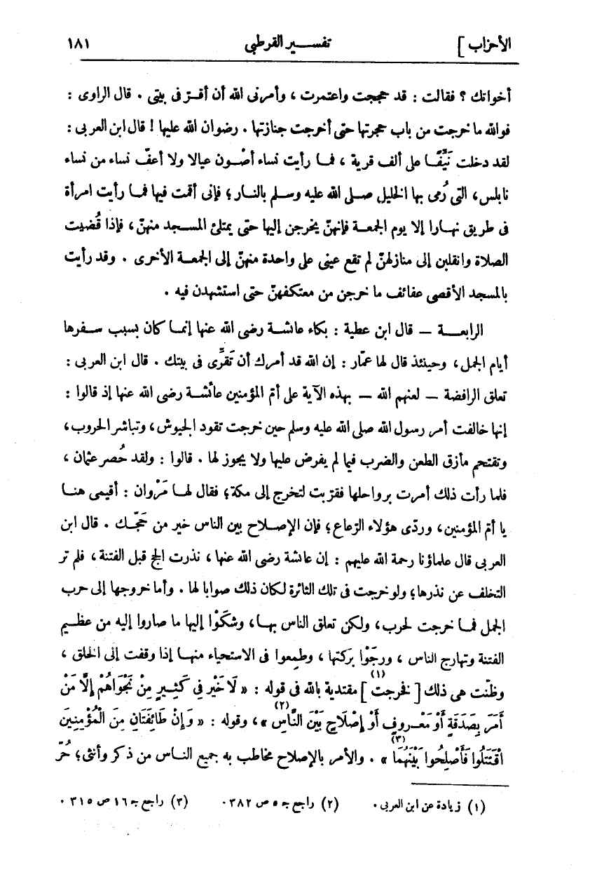أَخَوَاتُكِ؟ فَقَالَتْ: قَدْ حَجَجْتُ وَاعْتَمَرْتُ، وَأَمَرَنِي اللَّهُ أَنْ أَقِرَّ فِي بَيْتِي. قَالَ الرَّاوِي: فَوَاللَّهِ مَا خَرَجَتْ مِنْ بَابِ حُجْرَتِهَا حَتَّى أُخْرِجَتْ جِنَازَتُهَا. رِضْوَانُ اللَّهِ عَلَيْهَا! قَالَ ابْنُ الْعَرَبِيِّ: لَقَدْ دَخَلْتُ نَيِّفًا عَلَى أَلْفِ قَرْيَةٍ فَمَا رَأَيْتُ نِسَاءً أَصْوَنَ عِيَالًا وَلَا أَعَفَّ نِسَاءً مِنْ نِسَاءِ نَابُلُسَ، الَّتِي رُمِيَ بِهَا الْخَلِيلُ صَلَّى اللَّهُ عَلَيْهِ وَسَلَّمَ النار، فَإِنِّي أَقَمْتُ فِيهَا فَمَا رَأَيْتُ امْرَأَةً فِي طَرِيقٍ نَهَارًا إِلَّا يَوْمَ الْجُمُعَةِ فَإِنَّهُنَّ يَخْرُجْنَ إِلَيْهَا حَتَّى يَمْتَلِئَ الْمَسْجِدُ مِنْهُنَّ، فَإِذَا قُضِيَتِ الصَّلَاةُ وَانْقَلَبْنَ إِلَى مَنَازِلِهِنَّ لَمْ تَقَعْ عَيْنَيَّ عَلَى وَاحِدَةٍ مِنْهُنَّ إِلَى الْجُمُعَةِ الْأُخْرَى. وَقَدْ رَأَيْتُ بِالْمَسْجِدِ الْأَقْصَى عَفَائِفَ مَا خَرَجْنَ مِنْ مُعْتَكَفِهِنَّ حَتَّى اسْتُشْهِدْنَ فِيهِ. الرَّابِعَةُ- قَالَ ابْنُ عَطِيَّةَ: بُكَاءُ عَائِشَةَ رَضِيَ اللَّهُ عَنْهَا إِنَّمَا كَانَ بِسَبَبِ سَفَرِهَا أَيَّامَ الْجَمَلِ، وَحِينَئِذٍ قَالَ لَهَا عَمَّارٌ: إِنَّ اللَّهَ قَدْ أَمَرَكِ أَنْ تَقِرِّي فِي بَيْتِكِ. قَالَ ابْنُ الْعَرَبِيِّ: تَعَلَّقَ الرَّافِضَةُ لَعَنَهُمُ اللَّهُ- بِهَذِهِ الْآيَةِ عَلَى أُمِّ الْمُؤْمِنِينَ عَائِشَةَ رَضِيَ اللَّهُ عَنْهَا إِذْ قَالُوا: إِنَّهَا خَالَفَتْ أَمَرَ رَسُولُ اللَّهِ صَلَّى اللَّهُ عَلَيْهِ وَسَلَّمَ حِينَ خَرَجَتْ تَقُودُ الْجُيُوشَ، وَتُبَاشِرُ الْحُرُوبَ، وَتَقْتَحِمُ مَأْزِقَ الطَّعْنِ وَالضَّرْبِ فِيمَا لَمْ يُفْرَضْ عَلَيْهَا وَلَا يَجُوزُ لَهَا. قَالُوا: وَلَقَدْ حُصِرَ عُثْمَانُ، فَلَمَّا رَأَتْ ذَلِكَ أَمَرَتْ بِرَوَاحِلِهَا فَقُرِّبَتْ لِتَخْرُجَ إِلَى مَكَّةَ، فَقَالَ لَهَا مَرْوَانُ: أَقِيمِي هُنَا يَا أُمَّ الْمُؤْمِنِينَ، وَرُدِّي هَؤُلَاءِ الرَّعَاعَ، فَإِنَّ الْإِصْلَاحَ بَيْنَ النَّاسِ خَيْرٌ مِنْ حَجِّكِ. قَالَ ابْنُ الْعَرَبِيِّ قَالَ عُلَمَاؤُنَا رَحْمَةُ اللَّهِ عَلَيْهِمْ: إِنَّ عَائِشَةَ رَضِيَ اللَّهُ عَنْهَا نذرت عَنْهَا، نَذَرَتِ الْحَجَّ قَبْلَ الْفِتْنَةِ، فَلَمْ تَرَ التَّخَلُّفَ عَنْ نَذْرِهَا، وَلَوْ خَرَجَتْ فِي تِلْكَ الثَّائِرَةِ لَكَانَ ذَلِكَ صَوَابًا لَهَا. وَأَمَّا خُرُوجُهَا إِلَى حَرْبِ الْجَمَلِ فَمَا خَرَجَتْ لِحَرْبٍ، وَلَكِنْ تَعَلَّقَ النَّاسُ بِهَا، وَشَكَوْا إِلَيْهَا مَا صَارُوا إِلَيْهِ مِنْ عَظِيمِ الْفِتْنَةِ وَتَهَارُجِ النَّاسِ، وَرَجَوْا بَرَكَتَهَا، وَطَمِعُوا فِي الِاسْتِحْيَاءِ مِنْهَا إِذَا وَقَفَتْ إِلَى الْخَلْقِ، وَظَنَّتْ هِيَ ذَلِكَ [فَخَرَجَتْ «١»] مُقْتَدِيَةً بِاللَّهِ فِي قَوْلِهِ:" لَا خَيْرَ فِي كَثِيرٍ مِنْ نَجْواهُمْ إِلَّا مَنْ أَمَرَ بِصَدَقَةٍ أَوْ مَعْرُوفٍ أَوْ إِصْلاحٍ بَيْنَ النَّاسِ" «٢» [النساء: ١١٤]، وَقَوْلِهِ:" وَإِنْ طائِفَتانِ مِنَ الْمُؤْمِنِينَ اقْتَتَلُوا فَأَصْلِحُوا بَيْنَهُما" «٣» [الحجرات: ٩] وَالْأَمْرُ بِالْإِصْلَاحِ مُخَاطَبٌ بِهِ جَمِيعُ النَّاسِ مِنْ ذكر وأنثى، حر