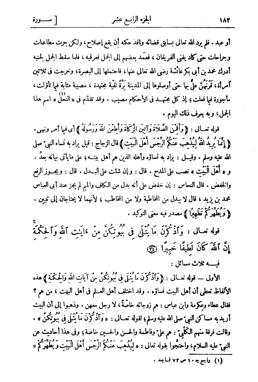 فيه ثلاثة مَسَائِلَ: الْأُولَى: قَوْلُهُ تَعَالَى:" وَاذْكُرْنَ مَا يُتْلى فِي بُيُوتِكُنَّ مِنْ آياتِ اللَّهِ وَالْحِكْمَةِ" هَذِهِ الْأَلْفَاظُ تُعْطِي أَنَّ أَهْلَ الْبَيْتِ نِسَاؤُهُ. وَقَدِ اخْتَلَفَ أَهْلُ الْعِلْمِ فِي أَهْلِ الْبَيْتِ، مَنْ هُمْ؟ فَقَالَ عَطَاءٌ وَعِكْرِمَةُ وَابْنُ عَبَّاسٍ: هُمْ زَوْجَاتُهُ خَاصَّةً، لَا رَجُلَ مَعَهُنَّ. وَذَهَبُوا إِلَى أَنَّ الْبَيْتَ أُرِيدَ بِهِ مَسَاكِنُ النَّبِيِّ صَلَّى اللَّهُ عَلَيْهِ وَسَلَّمَ، لِقَوْلِهِ تَعَالَى:" وَاذْكُرْنَ مَا يُتْلى فِي بُيُوتِكُنَّ". وَقَالَتْ فِرْقَةٌ مِنْهُمُ الْكَلْبِيُّ: هُمْ عَلِيٌّ وَفَاطِمَةُ وَالْحَسَنُ وَالْحُسَيْنُ خَاصَّةً، وَفِي هَذَا أَحَادِيثُ عَنِ النَّبِيِّ عَلَيْهِ السَّلَامُ، وَاحْتَجُّوا بِقَوْلِهِ تَعَالَى:" لِيُذْهِبَ عَنْكُمُ الرِّجْسَ أَهْلَ الْبَيْتِ وَيُطَهِّرَكُمْ"