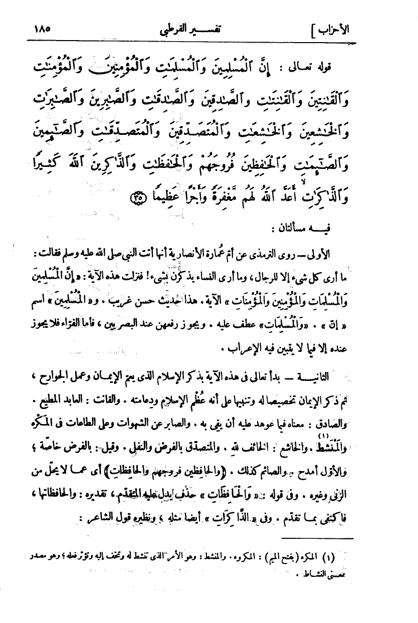 فِيهِ مَسْأَلَتَانِ: الْأُولَى- رَوَى التِّرْمِذِيُّ عَنْ أُمِّ عُمَارَةَ الْأَنْصَارِيَّةِ أَنَّهَا أَتَتِ النَّبِيَّ صَلَّى اللَّهُ عَلَيْهِ وَسَلَّمَ، فَقَالَتْ: مَا أَرَى كل شي إِلَّا لِلرِّجَالِ، وَمَا أَرَى النِّسَاءَ يُذْكَرْنَ بِشَيْءٍ! فَنَزَلَتْ هَذِهِ الْآيَةُ:" إِنَّ الْمُسْلِمِينَ وَالْمُسْلِماتِ وَالْمُؤْمِنِينَ وَالْمُؤْمِناتِ" الْآيَةَ. هَذَا حَدِيثٌ حَسَنٌ غَرِيبٌ. وَ" الْمُسْلِمِينَ" اسْمُ" إِنَّ"." وَالْمُسْلِماتِ" عَطْفٌ عَلَيْهِ. وَيَجُوزُ رَفْعُهُنَّ عِنْدَ الْبَصْرِيِّينَ، فَأَمَّا الْفَرَّاءُ فَلَا يَجُوزُ عِنْدَهُ إِلَّا فِيمَا لَا يَتَبَيَّنُ فِيهِ الْإِعْرَابُ. الثَّانِيَةُ- بَدَأَ تَعَالَى فِي هَذِهِ الْآيَةِ بِذِكْرِ الْإِسْلَامِ الَّذِي يَعُمُّ الْإِيمَانَ وَعَمَلَ الْجَوَارِحِ، ثُمَّ ذَكَرَ الْإِيمَانَ تَخْصِيصًا لَهُ وَتَنْبِيهًا عَلَى أَنَّهُ عُظْمُ الْإِسْلَامِ وَدِعَامَتُهُ. وَالْقَانِتُ: الْعَابِدُ الْمُطِيعُ. وَالصَّادِقُ: مَعْنَاهُ فِيمَا عُوهِدَ عَلَيْهِ أَنْ يَفِيَ بِهِ. وَالصَّابِرُ عَنِ الشَّهَوَاتِ وَعَلَى الطَّاعَاتِ فِي الْمَكْرَهِ وَالْمَنْشَطِ «١». وَالْخَاشِعُ: الْخَائِفُ لِلَّهِ. وَالْمُتَصَدِّقُ بِالْفَرْضِ وَالنَّفْلِ. وَقِيلَ. بِالْفَرْضِ خَاصَّةً، وَالْأَوَّلُ أَمْدَحُ. وَالصَّائِمُ كَذَلِكَ." وَالْحافِظِينَ فُرُوجَهُمْ وَالْحافِظاتِ" أَيْ عَمَّا لَا يَحِلُّ مِنَ الزِّنَى وَغَيْرِهِ. وَفِي قَوْلِهِ:" وَالْحافِظاتِ" حَذْفٌ يَدُلُّ عَلَيْهِ الْمُتَقَدِّمُ، تَقْدِيرُهُ: وَالْحَافِظَاتِهَا، فَاكْتُفِيَ بِمَا تَقَدَّمَ. وَفِي" الذَّاكِراتِ" أَيْضًا مِثْلُهُ، وَنَظِيرُهُ قَوْلُ الشاعر: