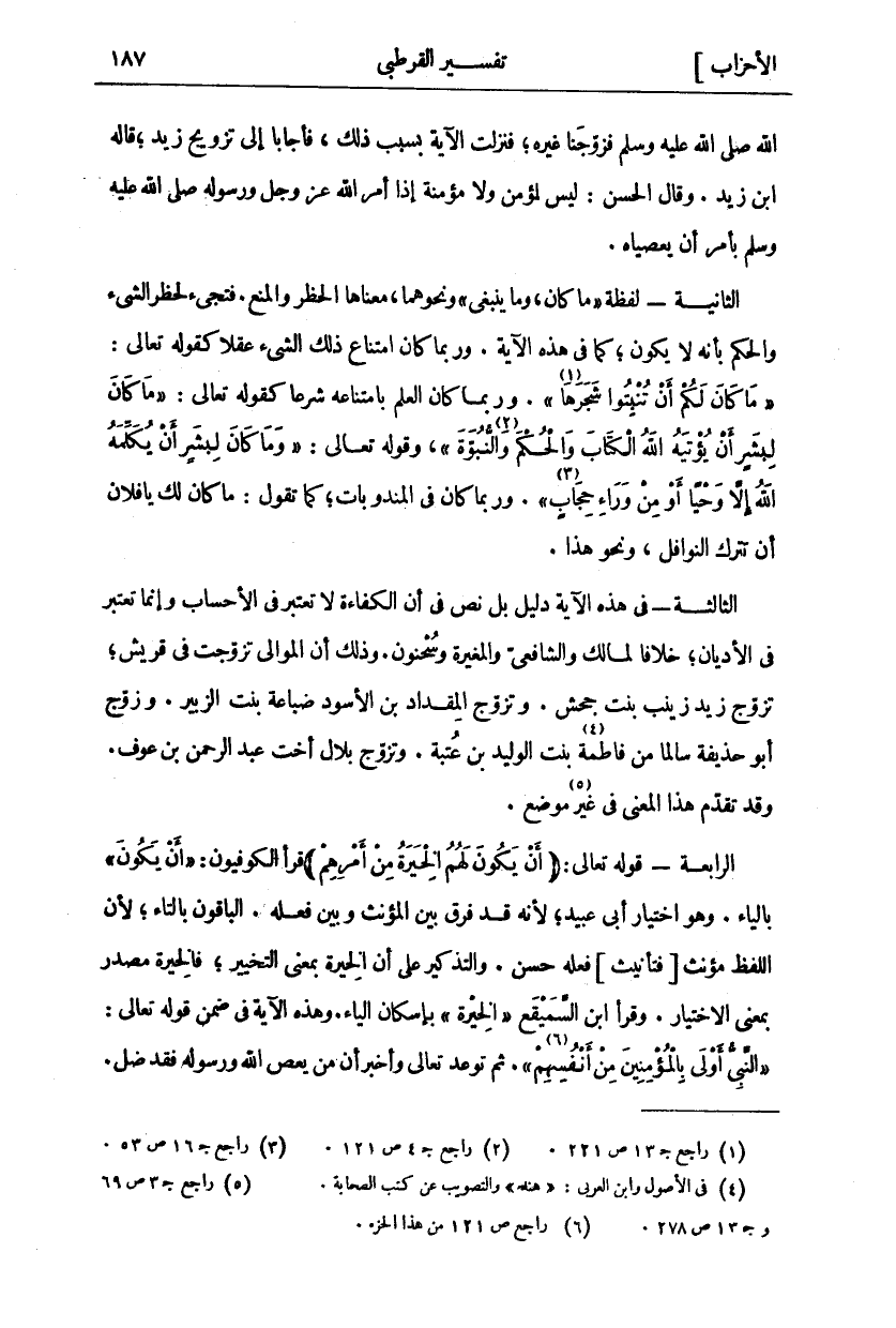 اللَّهِ صَلَّى اللَّهُ عَلَيْهِ وَسَلَّمَ فَزَوَّجَنَا غَيْرَهُ، فَنَزَلَتِ الْآيَةُ بِسَبَبِ ذَلِكَ، فَأَجَابَا إِلَى تَزْوِيجِ زَيْدٍ، قَالَهُ ابْنُ زَيْدٍ. وَقَالَ الْحَسَنُ: لَيْسَ لِمُؤْمِنٍ وَلَا مُؤْمِنَةٍ إِذَا أَمَرَ اللَّهُ عَزَّ وَجَلَّ وَرَسُولُهُ صَلَّى اللَّهُ عَلَيْهِ وَسَلَّمَ بِأَمْرٍ أَنْ يَعْصِيَاهُ. الثَّانِيَةُ: لَفْظَةُ" مَا كَانَ، وَمَا يَنْبَغِي" وَنَحْوِهِمَا، مَعْنَاهَا الْحَظْرُ وَالْمَنْعُ. فَتَجِيءُ لِحَظْرِ الشَّيْءِ وَالْحُكْمِ بِأَنَّهُ لَا يَكُونُ، كَمَا فِي هَذِهِ الْآيَةِ. وَرُبَّمَا كَانَ امْتِنَاعُ ذَلِكَ الشَّيْءِ عَقْلًا كَقَوْلِهِ تَعَالَى:" مَا كانَ لَكُمْ أَنْ تُنْبِتُوا شَجَرَها" «١» [النمل: ٦٠]. وَرُبَّمَا كَانَ الْعِلْمُ بِامْتِنَاعِهِ شَرْعًا كَقَوْلِهِ تَعَالَى:" مَا كانَ لِبَشَرٍ أَنْ يُؤْتِيَهُ اللَّهُ الْكِتابَ وَالْحُكْمَ وَالنُّبُوَّةَ" «٢»، وَقَوْلِهِ تَعَالَى: (وَما كانَ لِبَشَرٍ أَنْ يُكَلِّمَهُ اللَّهُ إِلَّا وَحْياً أَوْ مِنْ وَراءِ حِجابٍ) «٣» [الشورى: ٥١]. وَرُبَّمَا كَانَ فِي الْمَنْدُوبَاتِ، كَمَا تَقُولُ: مَا كَانَ لَكَ يَا فُلَانُ أَنْ تَتْرُكَ النَّوَافِلَ، وَنَحْوَ هَذَا. الثَّالِثَةُ- فِي هَذِهِ الْآيَةِ دَلِيلٌ بَلْ نَصٌّ فِي أَنَّ الْكَفَاءَةَ لَا تُعْتَبَرُ فِي الْأَحْسَابِ وَإِنَّمَا تُعْتَبَرُ فِي الْأَدْيَانِ، خِلَافًا لِمَالِكٍ وَالشَّافِعِيِّ وَالْمُغِيرَةِ وَسَحْنُونٍ. وَذَلِكَ أَنَّ الْمَوَالِيَ تَزَوَّجَتْ فِي قُرَيْشٍ، تَزَوَّجَ زَيْدٌ زَيْنَبَ بِنْتَ جَحْشٍ. وَتَزَوَّجَ الْمِقْدَادُ بْنُ الْأَسْوَدِ ضُبَاعَةَ بِنْتَ الزُّبَيْرٍ. وَزَوَّجَ أَبُو حُذَيْفَةَ سَالِمًا مِنْ فَاطِمَةَ «٤» بِنْتِ الْوَلِيدِ بْنِ عُتْبَةَ. وَتَزَوَّجَ بِلَالٌ أُخْتَ عَبْدِ الرَّحْمَنِ بْنِ عَوْفٍ. وَقَدْ تَقَدَّمَ هَذَا الْمَعْنَى فِي غَيْرِ «٥» مَوْضِعٍ. الرَّابِعَةُ- قَوْلُهُ تَعَالَى:" أَنْ يَكُونَ لَهُمُ الْخِيَرَةُ مِنْ أَمْرِهِمْ" قَرَأَ الْكُوفِيُّونَ:" أَنْ يَكُونَ" بِالْيَاءِ. وَهُوَ اخْتِيَارُ أَبِي عُبَيْدٍ، لِأَنَّهُ قَدْ فَرَّقَ بَيْنَ الْمُؤَنَّثِ وَبَيْنَ فِعْلِهِ. الْبَاقُونَ بِالتَّاءِ، لِأَنَّ اللَّفْظَ مُؤَنَّثٌ [فَتَأْنِيثُ] فِعْلِهِ حَسَنٌ. وَالتَّذْكِيرُ عَلَى أَنَّ الْخِيَرَةَ بِمَعْنَى التَّخْيِيرِ، فَالْخِيَرَةُ مَصْدَرٌ بِمَعْنَى الِاخْتِيَارِ. وَقَرَأَ ابْنُ السَّمَيْقَعِ" الْخِيرَةَ" بِإِسْكَانِ الْيَاءِ. وَهَذِهِ الْآيَةُ فِي ضِمْنِ قَوْلِهِ تَعَالَى:" النَّبِيُّ أَوْلى بِالْمُؤْمِنِينَ مِنْ أَنْفُسِهِمْ" «٦» [الأحزاب: ٦]. ثم توعد تعالى وأخبر أن من يعصى الله ورسوله فقد ضل.