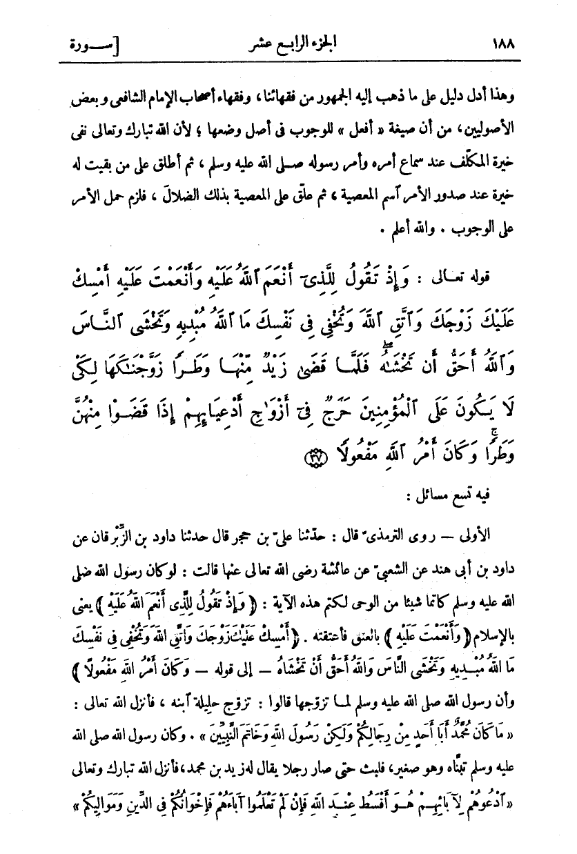 وَإِذْ تَقُولُ لِلَّذِي أَنْعَمَ اللَّهُ عَلَيْهِ وَأَنْعَمْتَ عَلَيْهِ أَمْسِكْ عَلَيْكَ زَوْجَكَ وَاتَّقِ اللَّهَ وَتُخْفِي فِي نَفْسِكَ مَا اللَّهُ مُبْدِيهِ وَتَخْشَى النَّاسَ وَاللَّهُ أَحَقُّ أَنْ تَخْشاهُ فَلَمَّا قَضى زَيْدٌ مِنْها وَطَراً زَوَّجْناكَها لِكَيْ لَا يَكُونَ عَلَى الْمُؤْمِنِينَ حَرَجٌ فِي أَزْواجِ أَدْعِيائِهِمْ إِذا قَضَوْا مِنْهُنَّ وَطَراً وَكانَ أَمْرُ اللَّهِ مَفْعُولاً (٣٧)